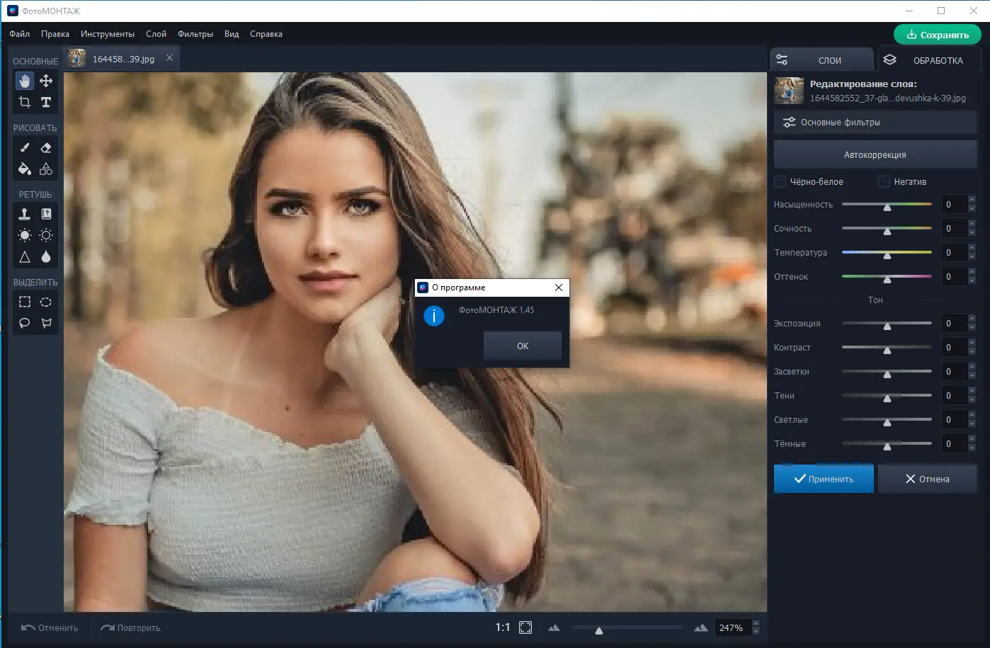 ФотомОНТАЖ — это мощный графический редактор, разработанный для создания реалистичных фотомонтажей и качественной обработки изображений. Программа предлагает широкий набор инструментов для ретуши, замены фона, работы со слоями и применения спецэффектов. Подходит как новичкам, так и опытным пользователям, стремящимся к профессиональному результату без сложного обучения.