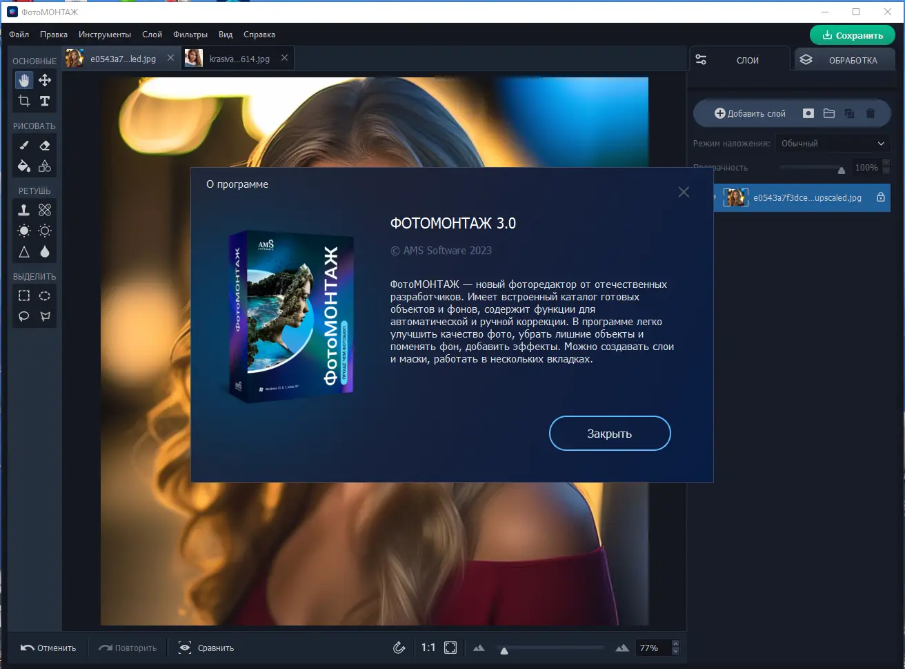 ФотоМОНТАЖ — это мощный редактор для обработки фото с поддержкой слоев, который позволяет выполнять сложный фотомонтаж, ретушь лиц, замену фона и цветокоррекцию. Программа подходит как для новичков, так и для опытных пользователей, стремящихся к профессиональному результату без необходимости изучать сложные инструменты.