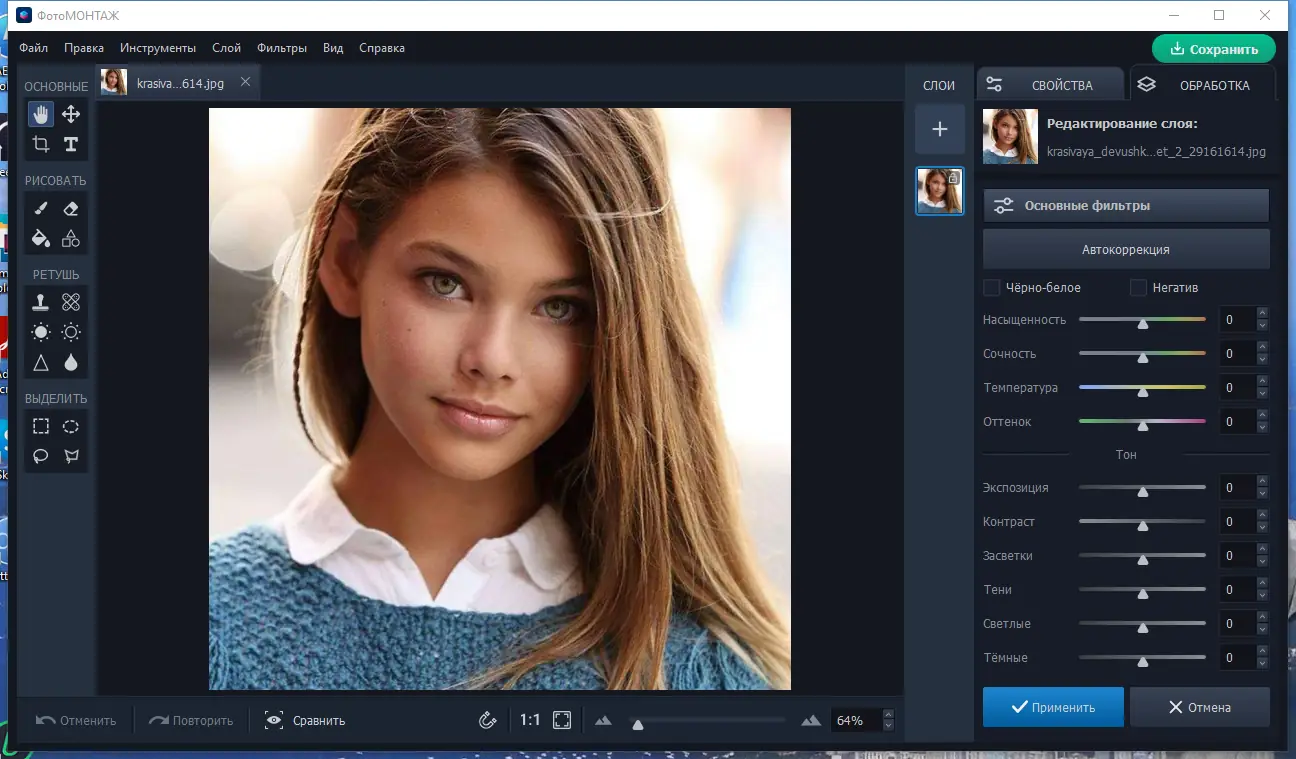 ФотоМОНТАЖ — это многофункциональный редактор фото с поддержкой слоев, который позволяет выполнять качественный фотомонтаж, ретушь лиц и цветокоррекцию. Программа подходит как для новичков, так и для опытных пользователей, желающих улучшить качество своих фотографий без сложных настроек. С её помощью можно объединять изображения, удалять ненужные объекты, менять фон и применять художественные эффекты.
