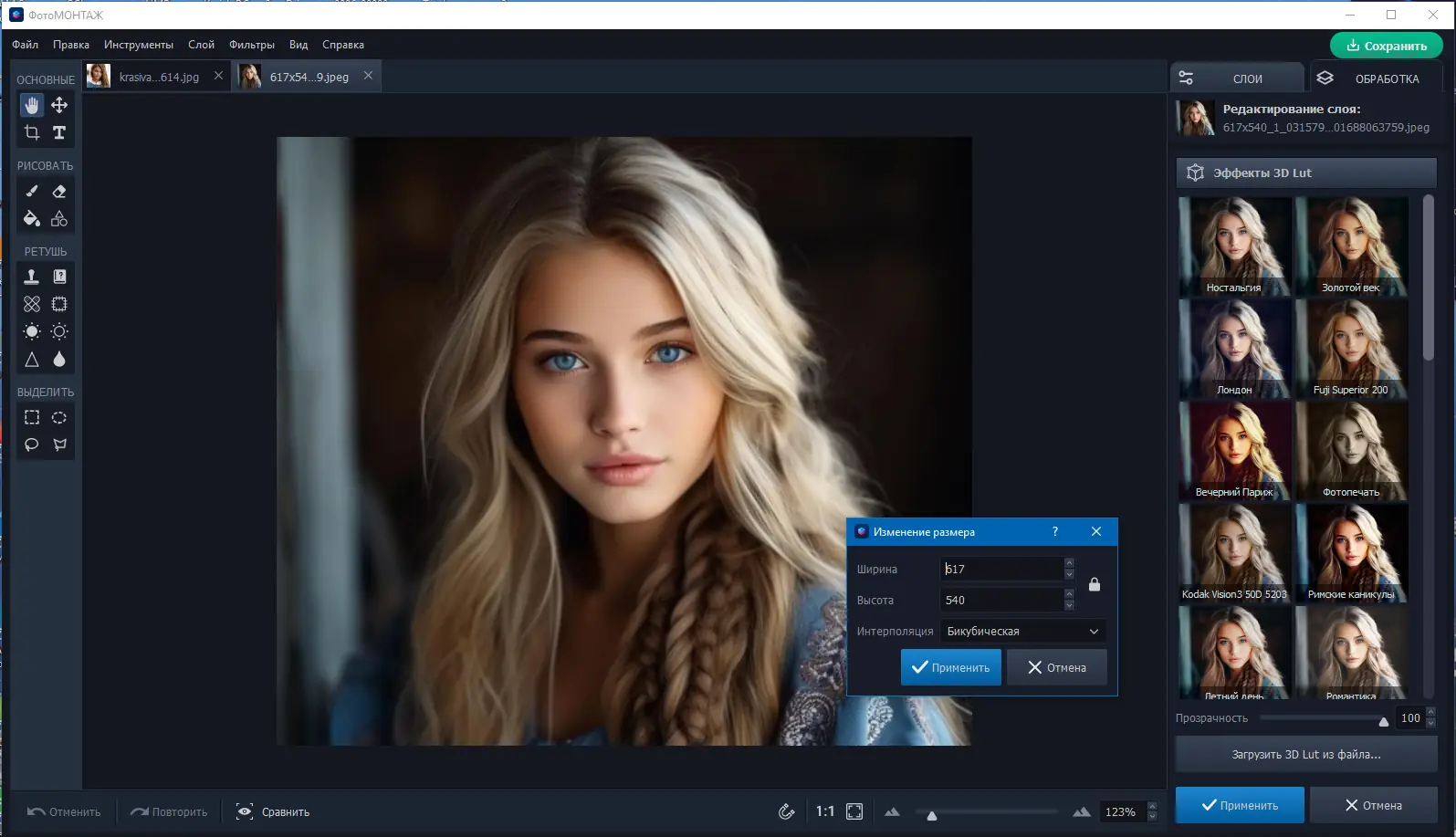 Интерфейс программы интуитивно понятен: все инструменты расположены в боковых панелях и легко доступны. Для начала работы достаточно открыть фото, добавить нужные слои и начать редактирование. Маски позволяют локально изменять цвет одежды или размывать фон, не затрагивая объекты на переднем плане. Режим рисования с настраиваемыми кистями помогает устранять дефекты или добавлять художественные элементы. При необходимости можно применить один из 30 спецэффектов — например, имитацию плёночной съёмки или атмосферу дождя. Работа с несколькими вкладками даёт возможность параллельно редактировать разные фотографии и переносить между ними элементы.