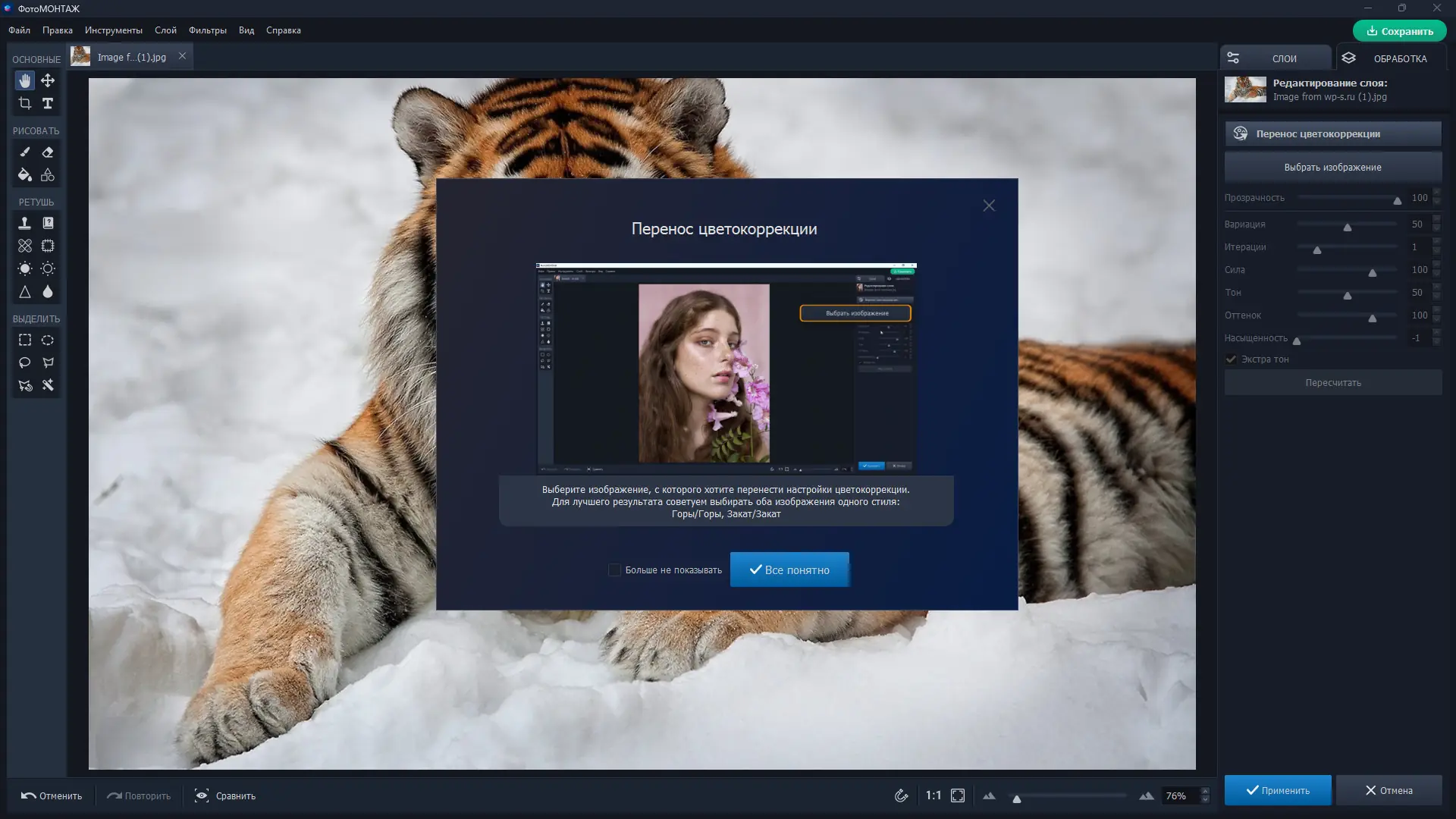 Интерфейс программы построен по принципу многооконного редактирования, что позволяет одновременно работать с несколькими изображениями. Для начала редактирования загрузите фото, выберите нужный инструмент — кисть, выделение, маску или цветовой корректор. Замену фона можно выполнить с помощью автоматического выделения объекта, а затем подставить любое изображение из библиотеки. Для ретуши лиц используйте кисти dodge и burn, чтобы добавить объём и выразительность. Цветокоррекцию можно проводить как вручную, с помощью кривых и гистограмм, так и применяя готовые фильтры. Все изменения сохраняются на отдельных слоях, что обеспечивает полный контроль над процессом.