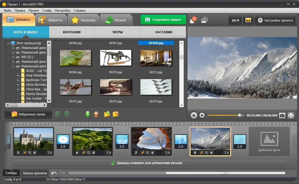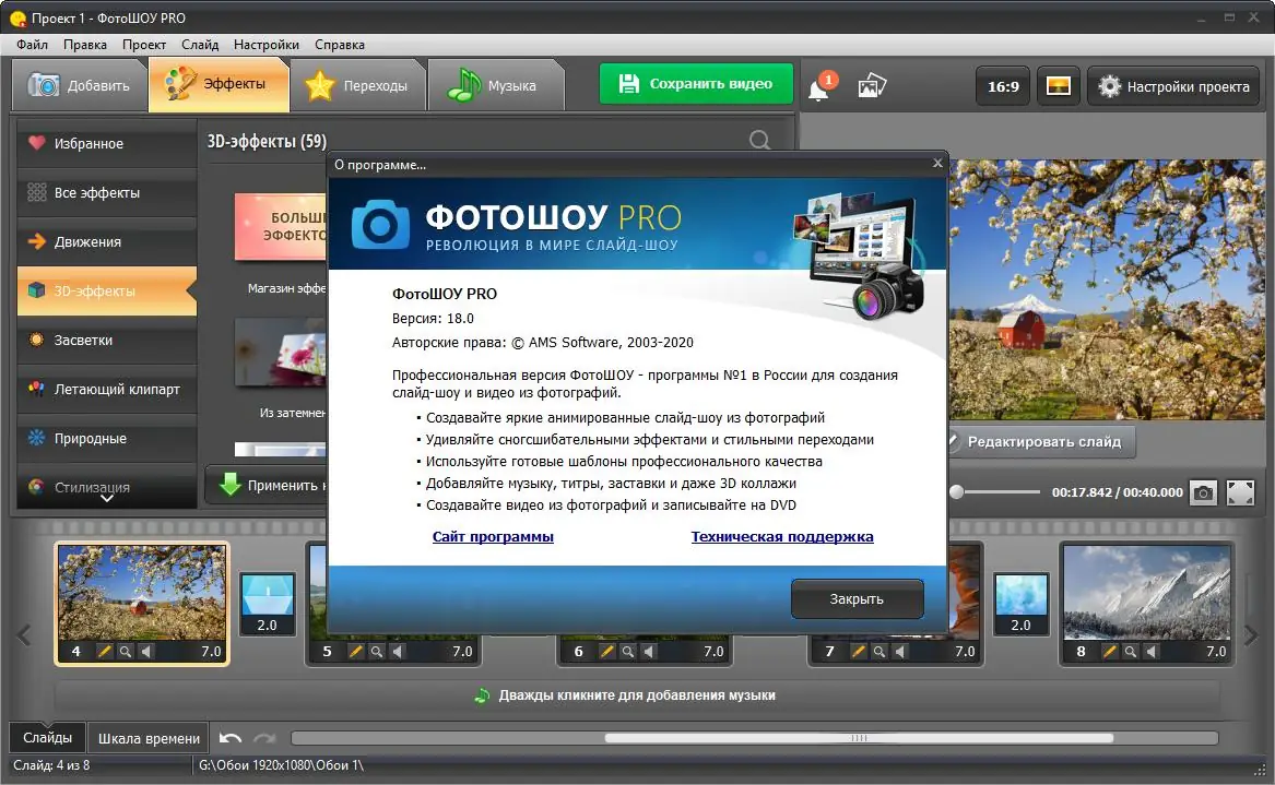 ФотоШОУ — это мощный инструмент для создания живых, динамичных слайд-шоу из фотографий с музыкой и эффектами анимации. Программа позволяет легко превращать статичные снимки в кинематографичные видео с использованием 3D-переходов, титров и профессиональных шаблонов. Подходит как для личного использования, так и для создания коммерческих проектов.