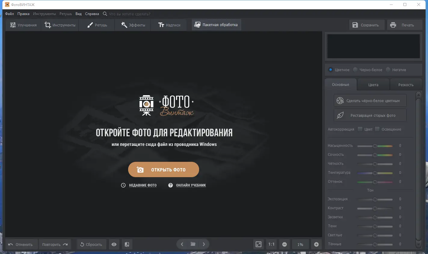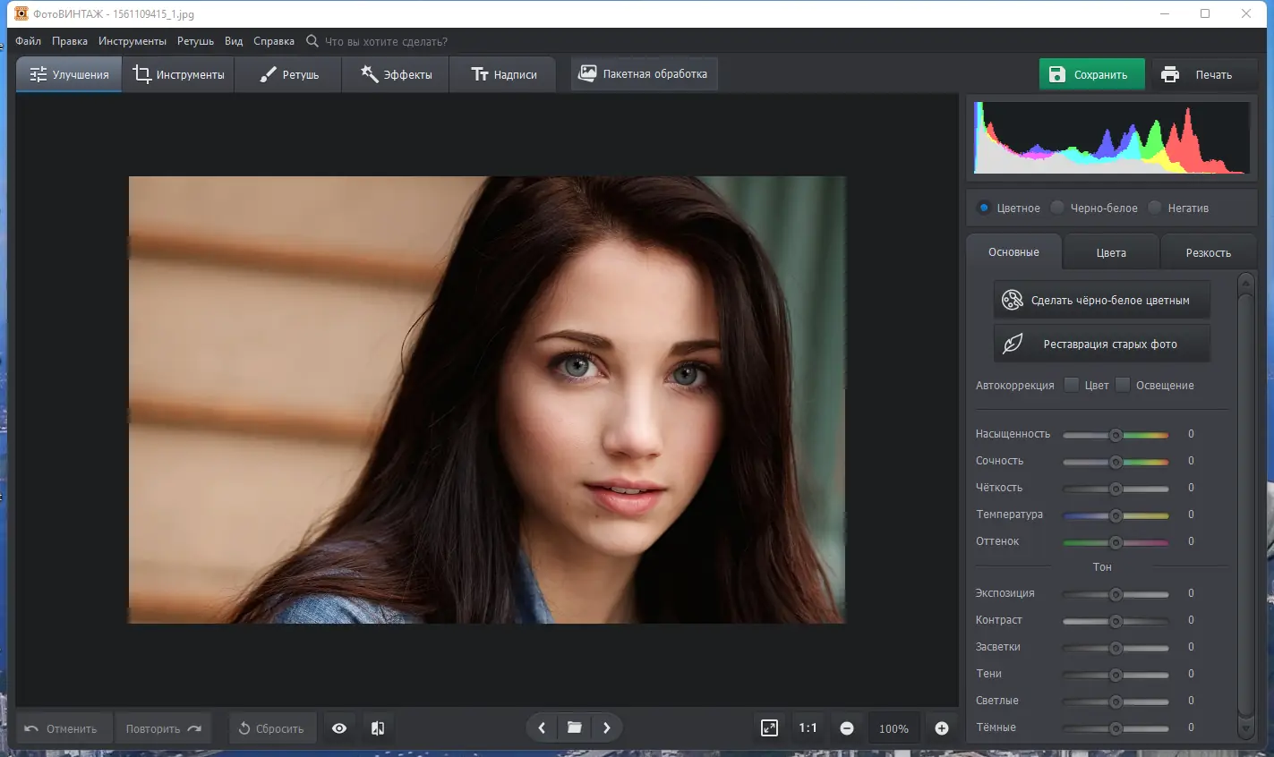 ФотоВИНТАЖ — это продвинутая программа для ретуширования старых фотографий, позволяющая устранить дефекты, улучшить чёткость, выполнить цветокоррекцию и автоматически раскрасить чёрно-белые снимки. Интуитивный интерфейс и мощные инструменты делают процесс восстановления фото простым и эффективным даже для новичков.
