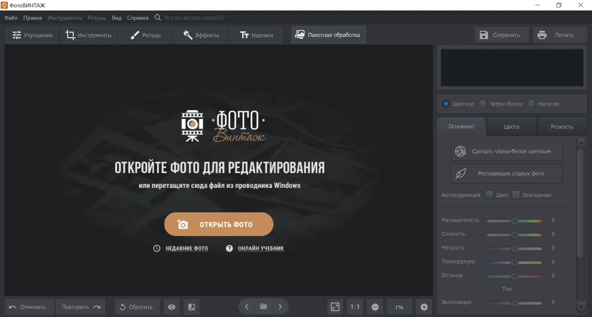 ФотоВИНТАЖ — это специализированный графический редактор, предназначенный для восстановления и улучшения старых фотографий. Программа позволяет устранять дефекты, повышать чёткость, выполнять цветокоррекцию и автоматически раскрашивать чёрно-белые снимки. Интерфейс интуитивно понятен, а функционал охватывает все ключевые задачи, связанные с реставрацией изображений.