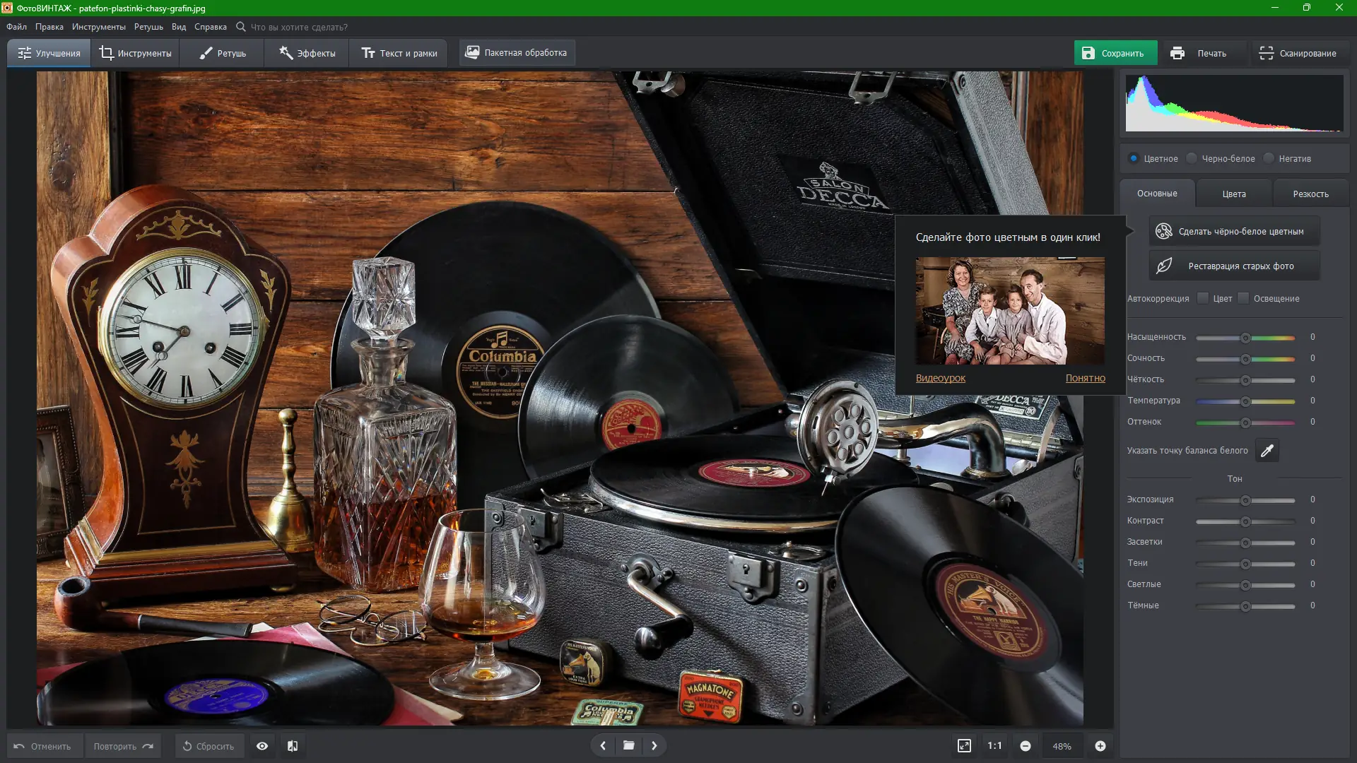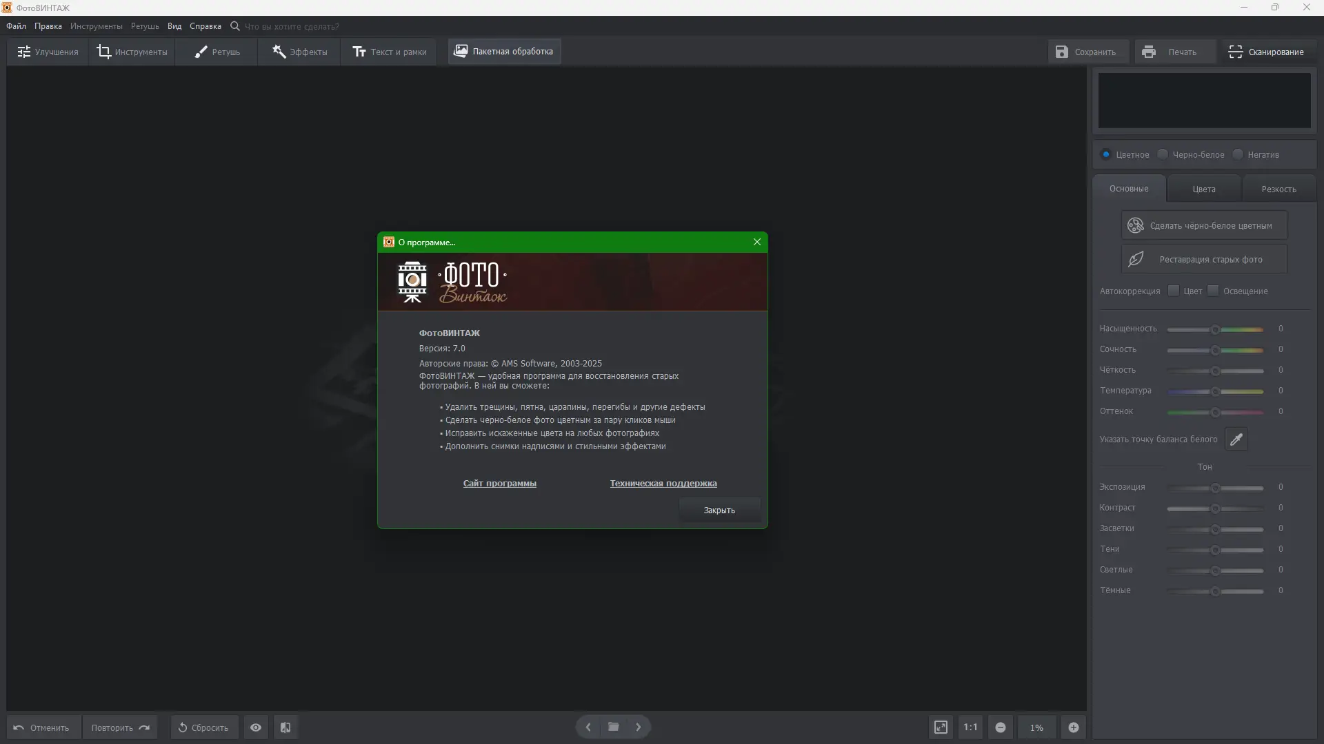 ФотоВИНТАЖ — современный редактор для восстановления старых фотографий, позволяющий устранить дефекты, улучшить чёткость, выполнить цветокоррекцию и оживить чёрно-белые снимки. Программа сочетает автоматизированные функции и ручные настройки, обеспечивая высокое качество ретуширования. Подходит как для домашнего использования, так и для подготовки архивных изображений к печати или публикации.