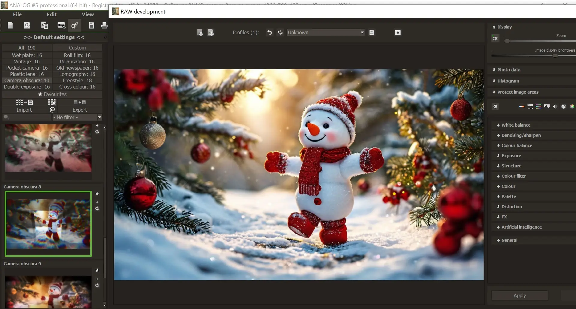 Franzis ANALOG — программное обеспечение, предназначенное для имитации эффектов аналоговой фотографии, позволяет превращать цифровые снимки в произведения с характерной зернистостью, насыщенными тонами и атмосферой старой пленки. Программа предлагает широкий набор фильтров, текстур и настроек, имитирующих особенности различных типов пленок, включая цветные, черно-белые и инфракрасные.