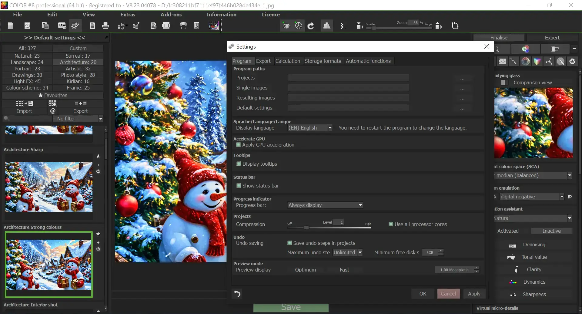 Использование Franzis COLOR начинается с загрузки изображения в рабочую область, где доступны все основные инструменты коррекции. Пользователь может выбрать нужный фильтр из библиотеки или вручную настроить параметры цвета, яркости и контраста. Каждое изменение отображается в режиме реального времени, что упрощает подбор оптимальных настроек. Для точечной работы предусмотрены маски и инструменты выделения, позволяющие применять эффекты к отдельным участкам снимка. При необходимости можно импортировать собственные LUT-файлы или созданные ранее пресеты, сохраняя их для повторного использования. Портативная версия программы не требует установки и запускается с любого носителя, что делает её удобной для мобильной работы.