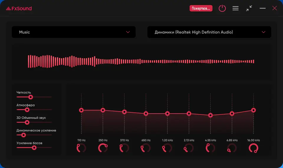 После установки FxSound автоматически запускается в фоне и начинает обработку звука без необходимости дополнительных действий. Основной интерфейс отображает анализатор спектра, текущий пресет и уровень громкости. Пользователь может выбрать один из готовых режимов: Музыка, Игры, Стриминговое видео или Наушники. Каждый из них оптимизирован под соответствующий тип контента. Ручная настройка доступна через эквалайзер с ползунками для разных частот. Также можно активировать режим объёмного звука, который расширяет стереоэффект и делает звучание более пространственным. Для тех, кто предпочитает максимальную громкость без потери качества, предусмотрен функционал усиления сигнала с сохранением динамического диапазона. Работа в мини-режиме позволяет держать окно поверх других приложений, что удобно при многозадачности.