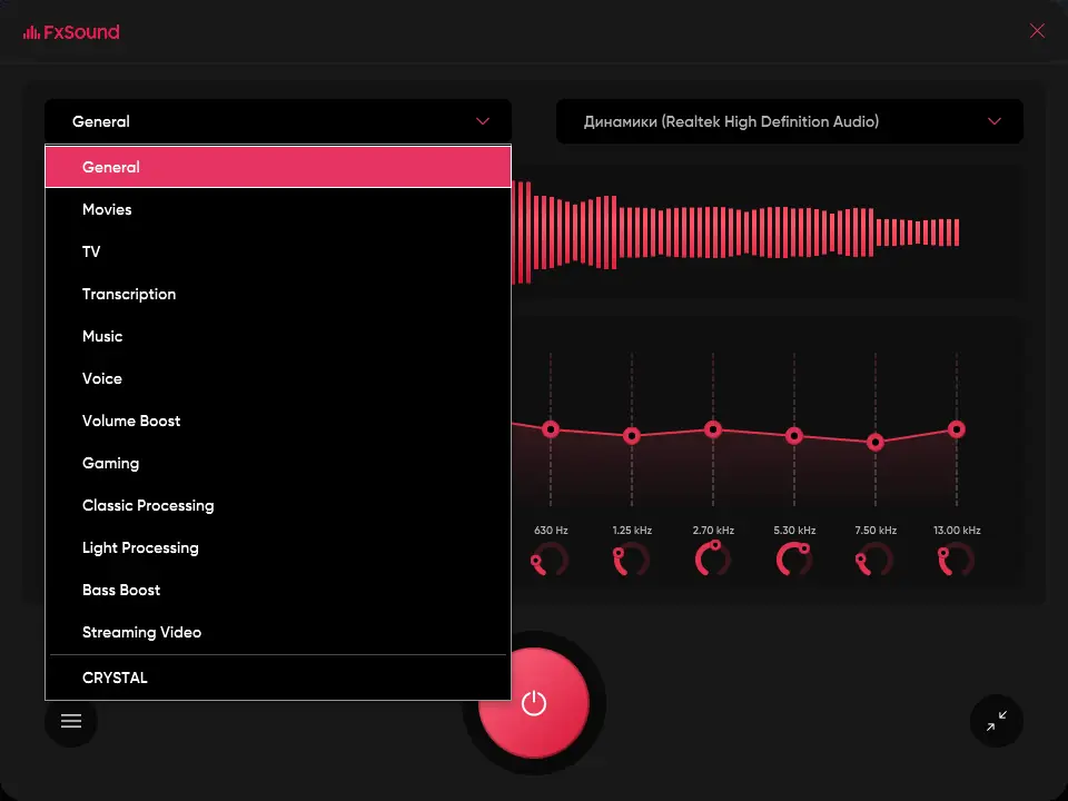 После установки FxSound автоматически запускается вместе с системой и начинает обработку звука. Основной интерфейс отображает текущий режим, уровень громкости и визуализацию спектра. Пользователь может выбрать один из предустановленных профилей — музыка, видео, игры или стриминг — либо перейти к ручной настройке через эквалайзер. Каждый слайдер соответствует определённому диапазону частот, что позволяет точно корректировать тембр. Для быстрого доступа предусмотрена компактная панель в трее, где можно включить или отключить эффекты, изменить пресет или активировать режим максимальной громкости.