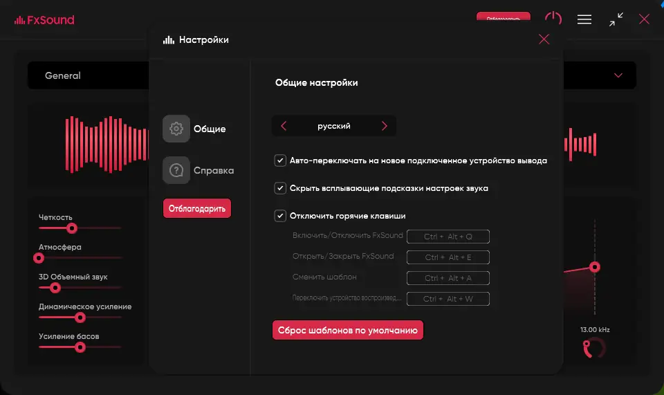 Использование FxSound не требует глубоких знаний в области акустики. После запуска приложение автоматически начинает обработку звука, применяя оптимальные настройки по умолчанию. Пользователь может переключаться между пресетами, подбирая наиболее подходящий режим в зависимости от текущего контента. Для тонкой настройки доступен эквалайзер с ползунками, позволяющий корректировать отдельные частоты. В версии 1.1.20.0 была улучшена навигация по интерфейсу — управляющие кнопки перемещены в верхнюю часть окна, что делает взаимодействие более удобным. Также добавлена возможность настройки горячих клавиш, что особенно полезно для пользователей с нестандартными раскладками. Управление эффектами и эквалайзером можно осуществлять с помощью клавиш со стрелками, переключаясь между элементами через Tab.
