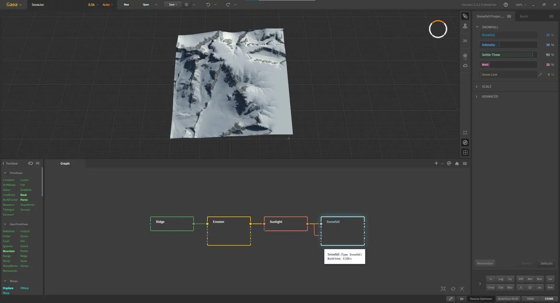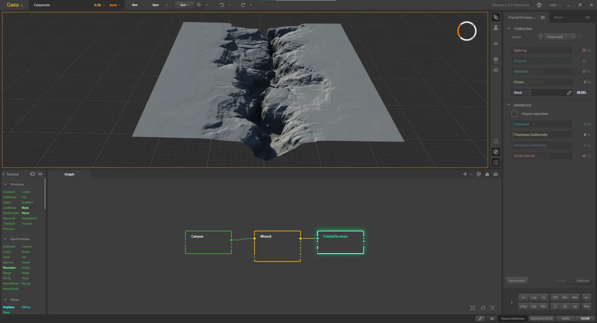 Работа в программе начинается с создания базового рельефа через примитивы, такие как плоскость или шум Перлина. Далее, с помощью узлов, пользователь может добавлять эрозию, осадочные процессы, тектонические сдвиги и другие природные эффекты. Каждый узел можно настраивать, комбинировать и сохранять в виде пресетов для повторного использования. Интерфейс построен вокруг рабочего пространства узлов, что делает процесс моделирования интуитивно понятным даже для новичков.