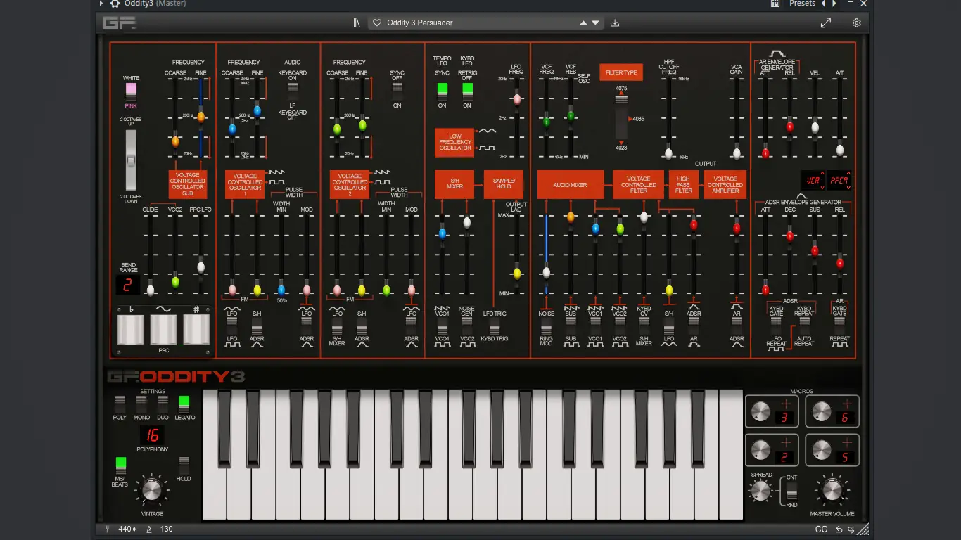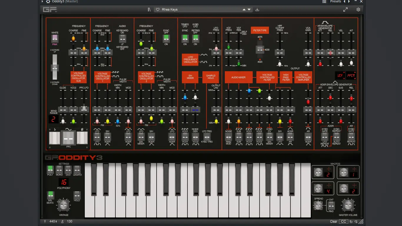 Интерфейс GForce — Oddity интуитивно понятен и стилистически повторяет оригинальный аппарат, что позволяет быстро ориентироваться в параметрах даже новичкам. Два синхронизируемых осциллятора, настраиваемый суб-осциллятор и кольцевой модулятор дают широкие возможности для создания сложных тембров. Фильтры 4023, 4035 и 4075 точно воссозданы, включая их уникальную динамику и насыщенность. Управление производительностью расширено за счёт программируемых макросов, поддержки велосити и полифонического афтертача, что повышает выразительность при игре на MIDI-клавиатуре. Новые эффекты — Distortion и Matrix Reverb — добавляют грязь, объём и пространственность, а ручка Vintage позволяет имитировать естественные температурные дрейфы и нестабильность аналоговой электроники. Благодаря полностью масштабируемому интерфейсу и трём винтажным скинам, пользователь может подстроить внешний вид под любой стиль работы.