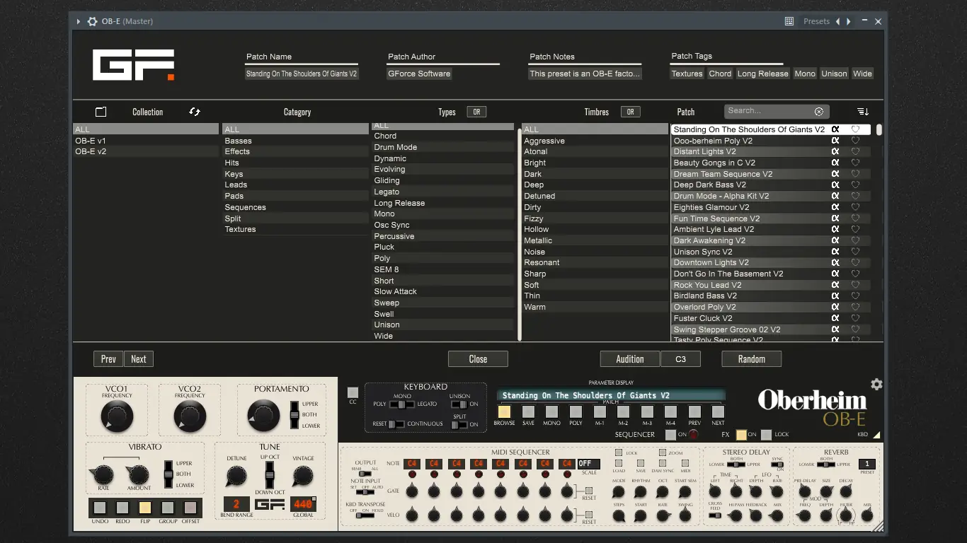 Программа предлагает широкий спектр возможностей для создания разнообразных звуков — от плотных басов и пронзительных свистков до атмосферных пэдов и экспериментальных текстур. Архитектура октафонического синтеза, ранее недоступная в цифровом виде, открывает новые горизонты для композиторов и саунд-дизайнеров. Встроенная реверберация, задержка и секвенсор делают инструмент автономным решением, не требующим дополнительных эффектов. Поддержка MPE и полифонического послекасания позволяет использовать OB-E с контроллерами, поддерживающими расширенную выразительность.