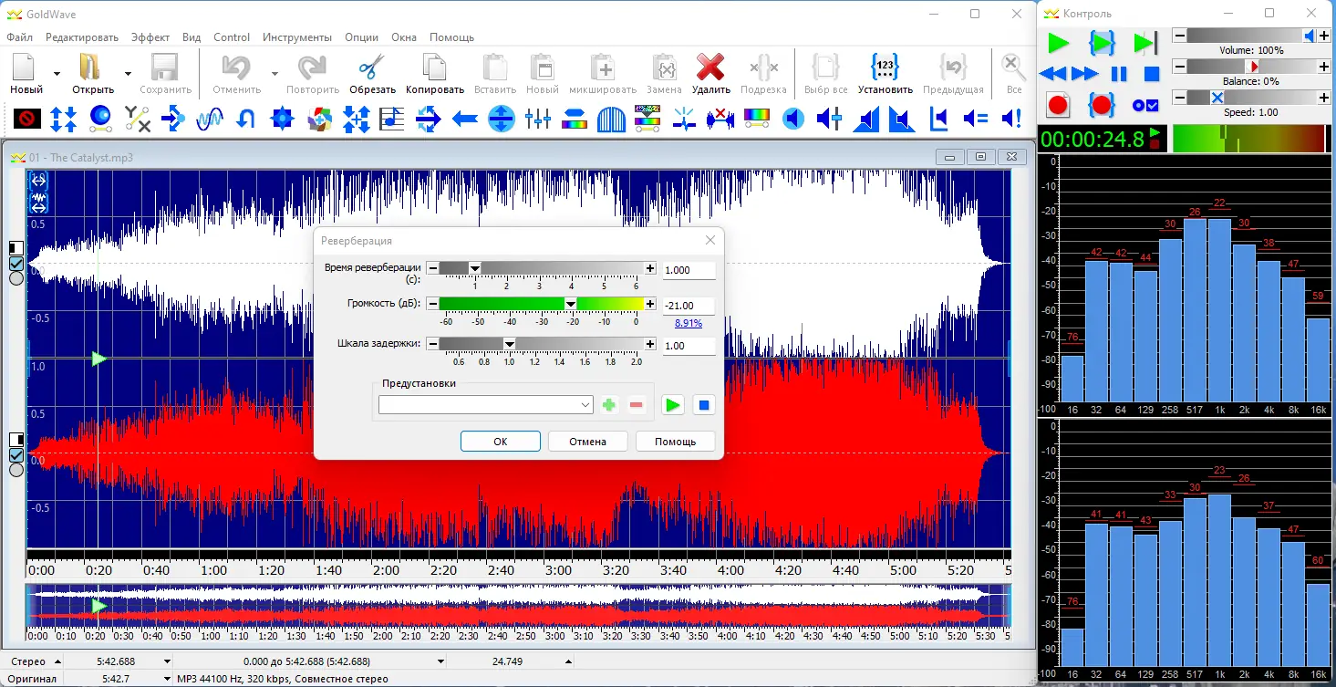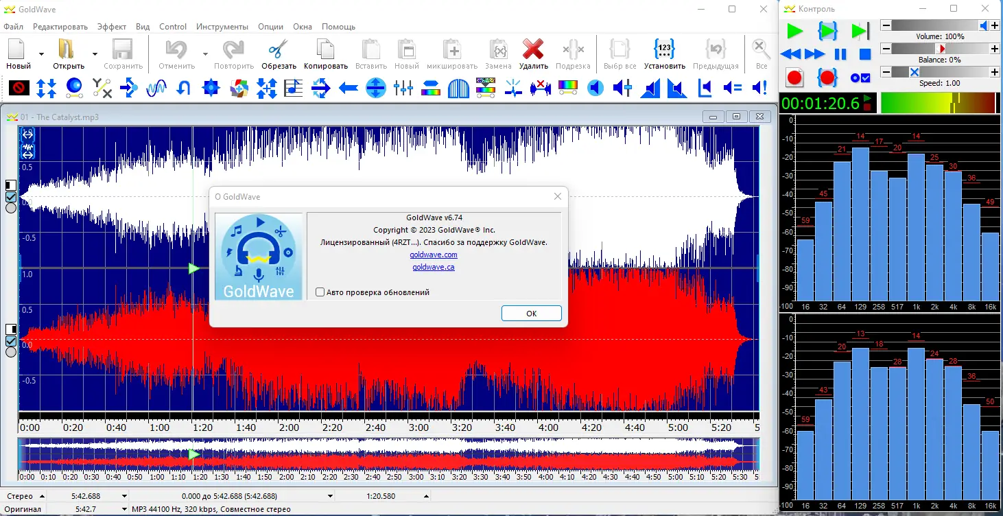 GoldWave представляет собой универсальный инструмент для воспроизведения, редактирования, микширования и анализа аудиофайлов. Программа отличается высокой производительностью, особенно при работе с большими файлами, и поддерживает форматы WAV, MP3, OGG, AIFF, AU, VOC, SND, FLAC и множество других. Она позволяет конвертировать аудио между форматами, применять эффекты, устранять шумы, восстанавливать старые записи и проводить точную цифровую обработку сигнала. Особое внимание уделено качеству звука — поддерживается работа с 24-битным аудио на частоте до 192 кГц.