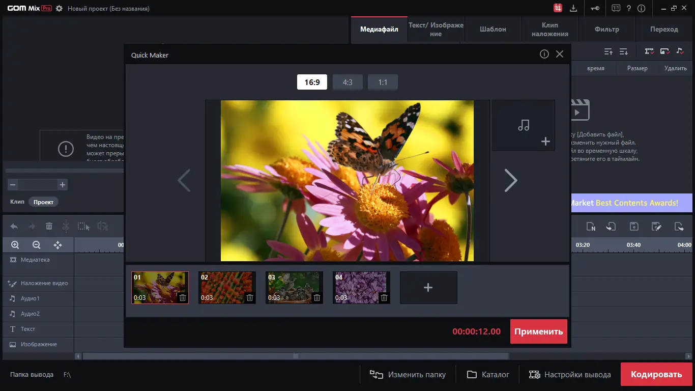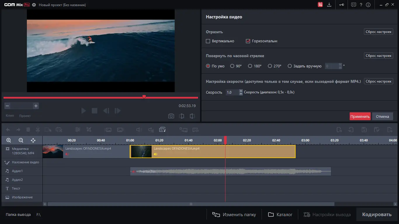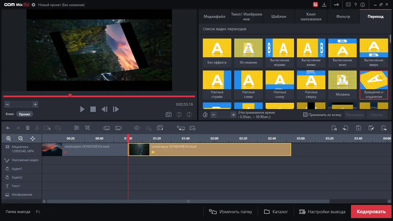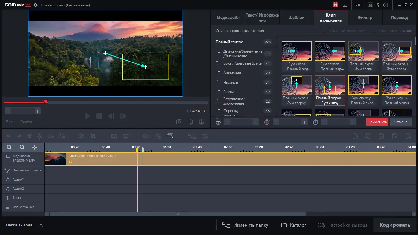 Использование GOM Mix Pro начинается с импорта медиафайлов на таймлайн, где доступны базовые операции: обрезка, разделение и перемещение клипов. Далее можно добавлять текстовые блоки, изображения или аудиодорожки, настраивая их продолжительность и положение. Эффекты и фильтры применяются через отдельные вкладки, где пользователь выбирает нужный стиль и регулирует интенсивность воздействия. После завершения монтажа видео кодируется в выбранный формат с возможностью контроля процесса в реальном времени. Готовый результат можно экспортировать локально или сразу опубликовать на YouTube, Facebook или Google Диск.