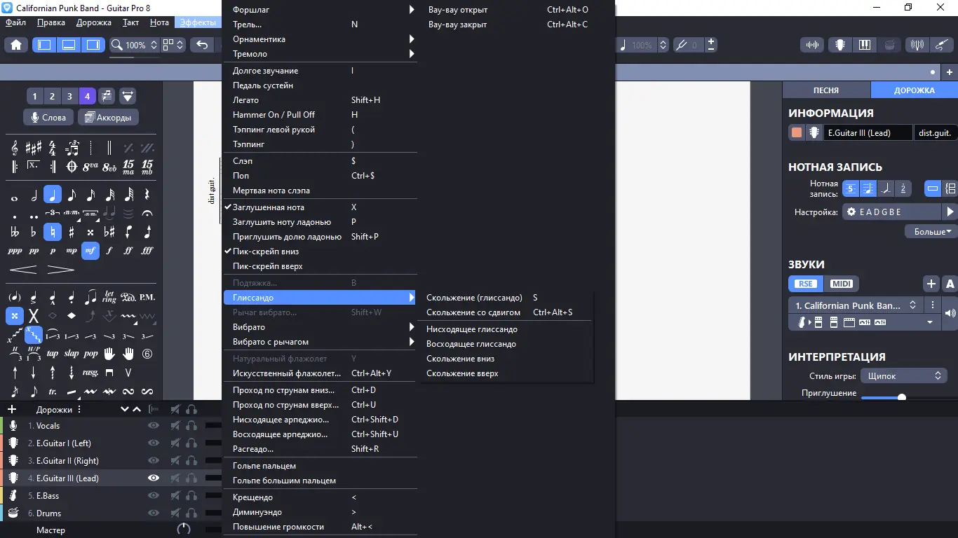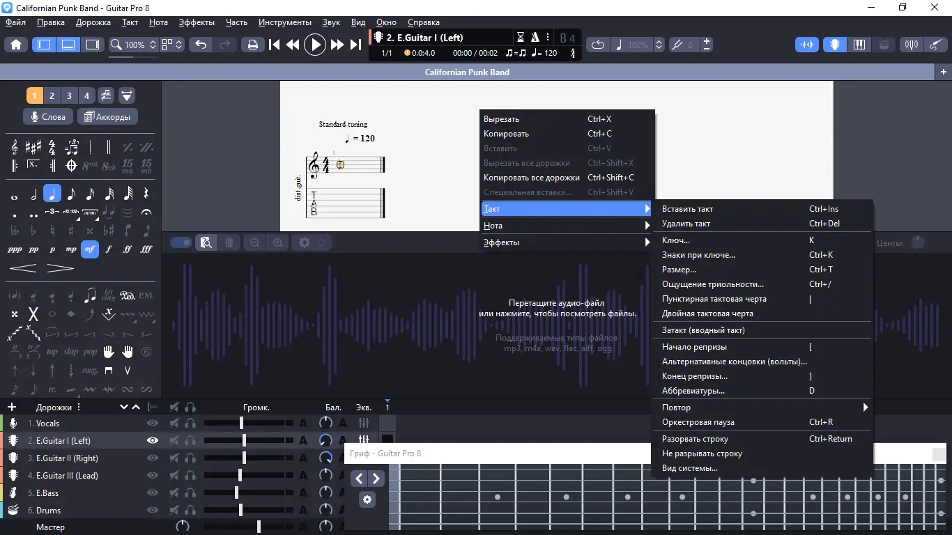 - Поддержка аудиодорожек и возможность записи живых инструментов в Guitar Pro 8.