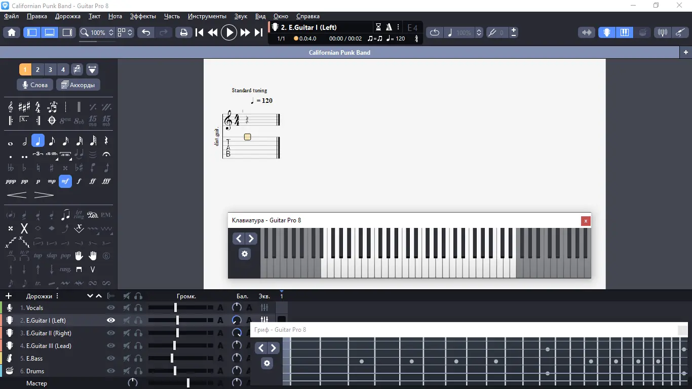 Guitar Pro — это специализированный нотный редактор, разработанный для гитаристов, басистов и других музыкантов, стремящихся к точному воспроизведению, анализу и созданию музыкальных произведений. Программа поддерживает работу с табулатурами и нотами, обеспечивая высокую точность воспроизведения звука и гибкие возможности редактирования. С её помощью можно создавать сложные аранжировки, настраивать звучание инструментов, использовать метроном и встроенный проигрыватель для обучения. Guitar Pro активно используется как новичками, так и профессионалами для изучения композиций, записи идей и подготовки к выступлениям.