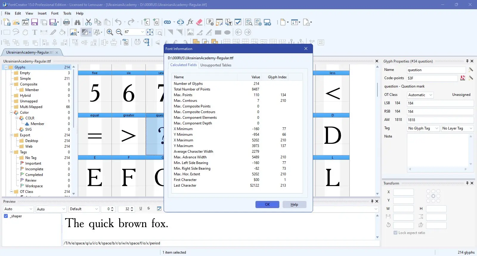 Работа с программой начинается с создания нового проекта или открытия существующего шрифта. Пользователь может импортировать изображения символов, размещая их в соответствующих ячейках глифов, или рисовать контуры вручную с помощью инструментов векторного редактирования. Встроенные функции автоматизации, такие как генерация жирного начертания или создание составных символов, значительно ускоряют процесс. Версия Professional включает инструменты проверки целостности шрифта, что повышает качество конечного продукта. Поддержка формата UFO и улучшенный экспорт CFF позволяют интегрировать FontCreator в профессиональные рабочие процессы.