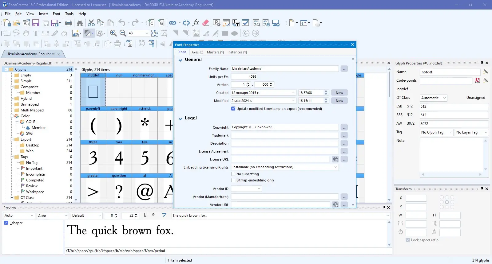 FontCreator доступен для операционных систем Windows и macOS, поддерживает русский язык интерфейса и совместим с актуальными версиями Windows. Программа регулярно обновляется, включая исправления ошибок и улучшения производительности. Последние версии предлагают улучшенный пользовательский интерфейс, быстрый экспорт, стабильную работу с буфером обмена и поддержку темного режима. Функция объединения контуров и улучшенный движок формирования делают редактирование более точным и удобным.