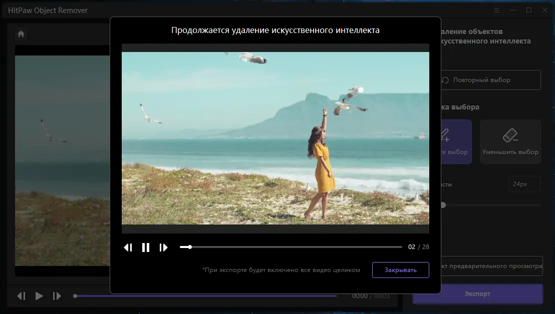 Использование программы начинается с загрузки видеофайла в интерфейс редактора. Далее пользователь выделяет объект, который необходимо удалить, после чего алгоритм ИИ автоматически отслеживает его перемещение по всем кадрам. После подтверждения действия программа обрабатывает видеопоследовательность, восстанавливая фон на каждом этапе. Готовый результат можно экспортировать в нужном формате с сохранением качества оригинала.