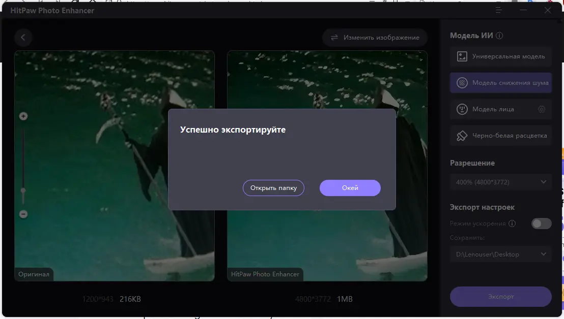 - Программа использует модель увеличения изображений, основанную на глубоком обучении, что позволяет масштабировать снимки в несколько раз без появления артефактов.
