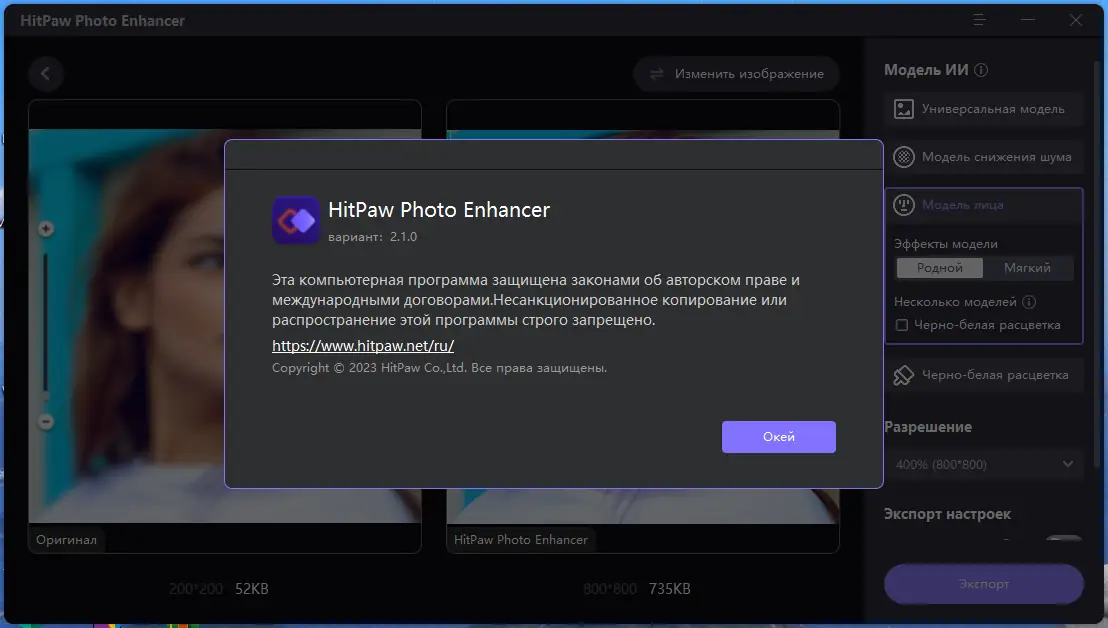 HitPaw Photo Enhancer разработан для автоматического улучшения цифровых фотографий без необходимости ручной настройки параметров. Он использует алгоритмы глубокого обучения, чтобы анализировать и восстанавливать детали изображения, устраняя шумы, повышая чёткость и увеличивая масштаб без размытия краёв. Программное обеспечение поддерживает различные режимы обработки, адаптированные под разные типы снимков.