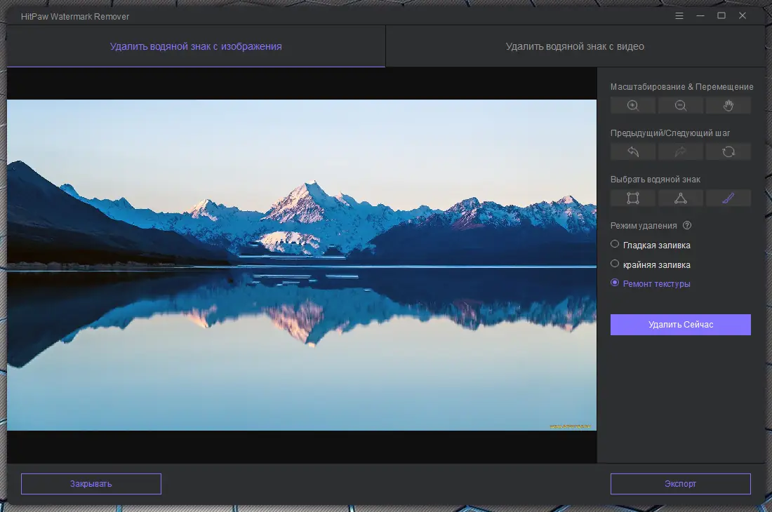 - Несколько режимов удаления: плавное заполнение, восстановление краев, воссоздание текстуры