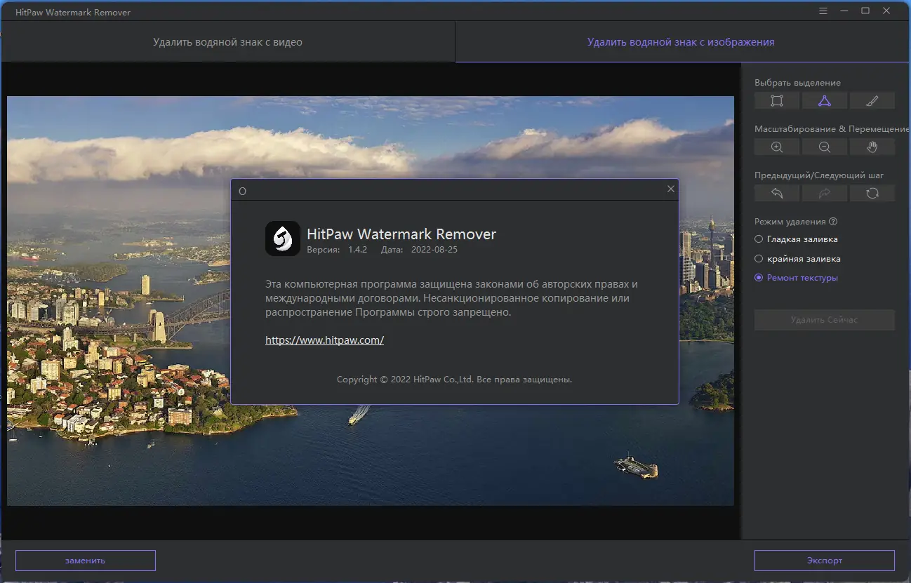- Позволяет удалять водяные знаки, логотипы и посторонние объекты с изображений
