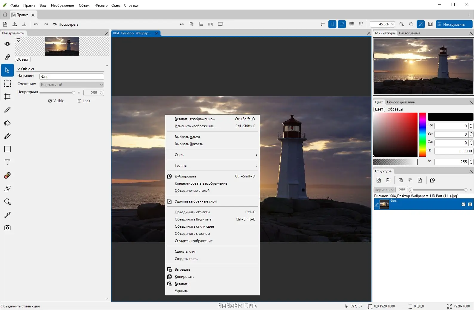 Hornil StylePix предлагает комплексное решение для редактирования и создания цифровых изображений. Программа поддерживает работу с различными форматами графических файлов, включая BMP, JPEG, PNG и GIF, обеспечивая стабильную производительность при обработке как простых, так и сложных проектов. Интерфейс приложения организован логично, позволяя быстро находить нужные инструменты и настройки.