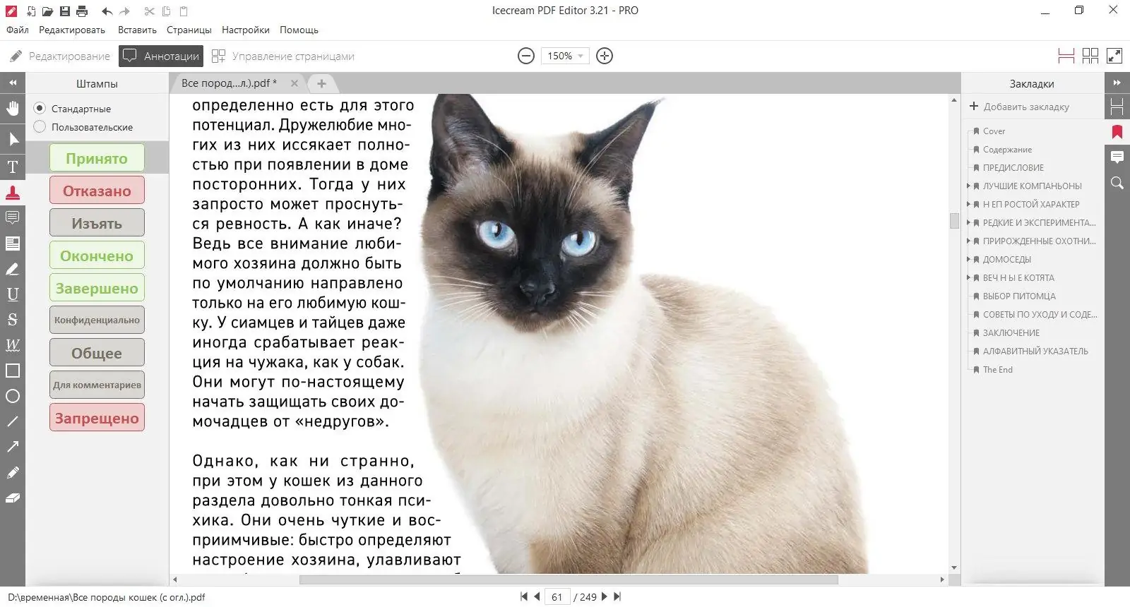 Пользоваться программой легко благодаря логичной структуре меню и визуальному редактору. После открытия файла пользователь видит полный контроль над содержимым: можно выделить текст для редактирования, вставить новые абзацы, изменить шрифт или цвет. Для аннотаций доступны инструменты рисования, добавления стрелок, прямоугольников и других фигур. Штампы настраиваются под нужды пользователя, что ускоряет процесс согласования документов. Водяные знаки можно настраивать по прозрачности, размеру и расположению. Все изменения сохраняются с учётом исходной структуры PDF, что гарантирует совместимость с другими программами.