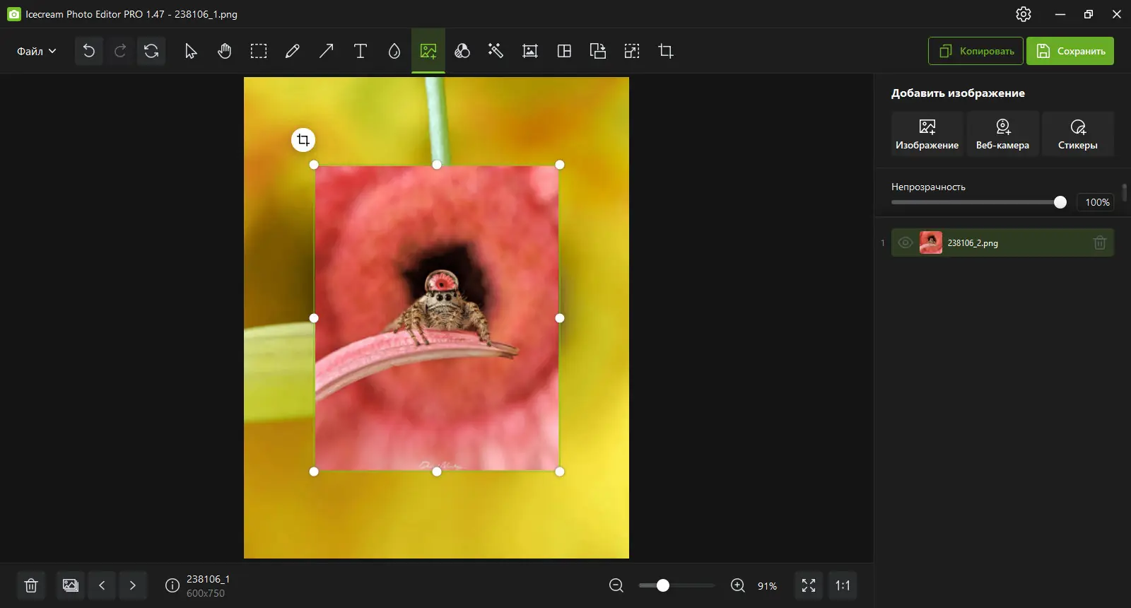 - Добавление текстовых надписей и графических элементов с настройкой прозрачности.
