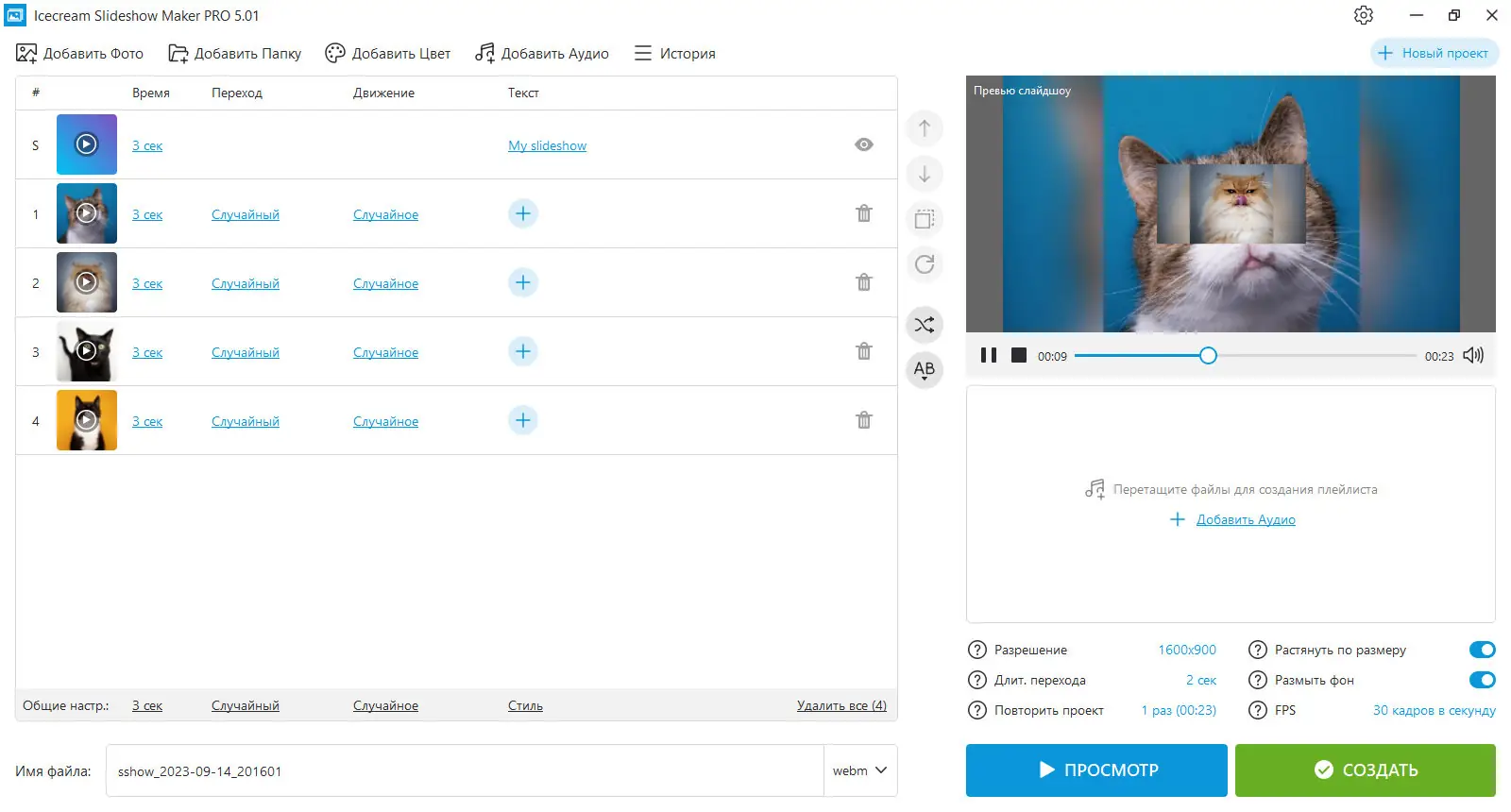 После запуска приложения пользователь может сразу начать добавлять фотографии через стандартный проводник. Каждое изображение можно настроить индивидуально: изменить длительность показа, выбрать тип перехода и эффект анимации. В отдельной вкладке добавляется аудиодорожка — поддерживается импорт файлов в форматах MP3, WAV и других. Можно указать момент начала воспроизведения трека и настроить постепенное затухание звука в конце. Перед созданием финального видео доступен полноценный предпросмотр, где можно заметить и исправить неточности.