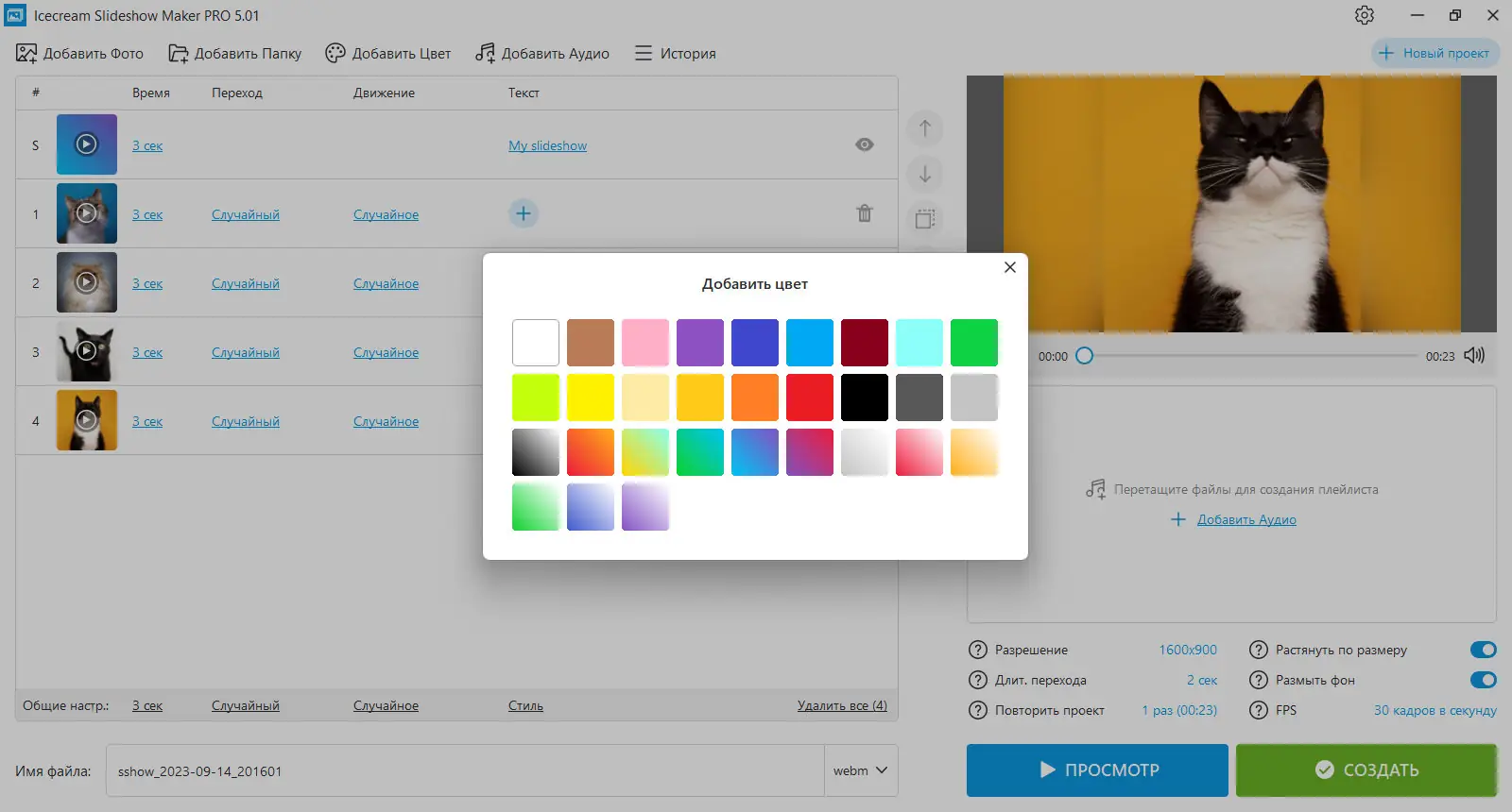 Icecream Slideshow Maker — это удобное приложение для создания видеослайдшоу из фотографий с возможностью добавления музыки и эффектов переходов. Программа поддерживает формат Full HD, позволяет настраивать длительность кадров и предварительный просмотр результата перед экспортом.