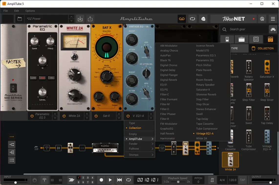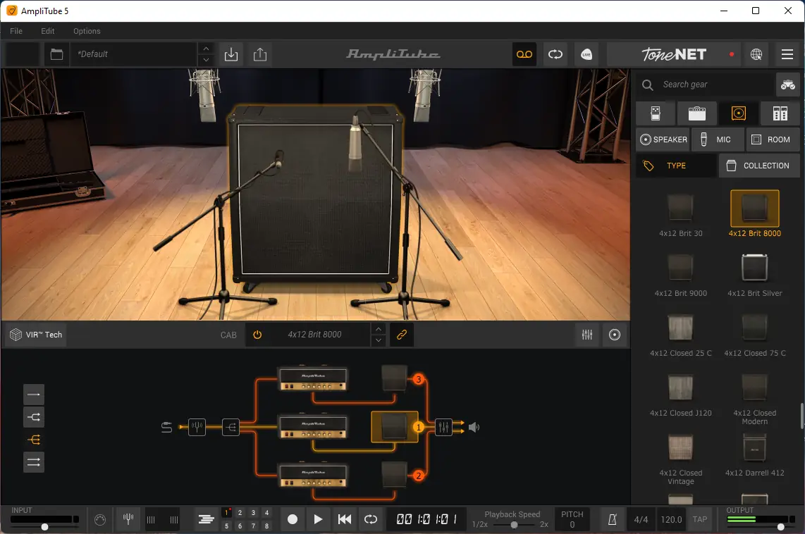 Работа с IK Multimedia AmpliTube основана на построении сигнальной цепочки из виртуальных устройств. Пользователь может размещать модели усилителей, кабинетов, педалей и эффектов в любом порядке, используя как последовательное, так и параллельное соединение. Встроенный редактор позволяет детально настраивать параметры каждого блока, включая тембр, громкость и пространственное расположение.
