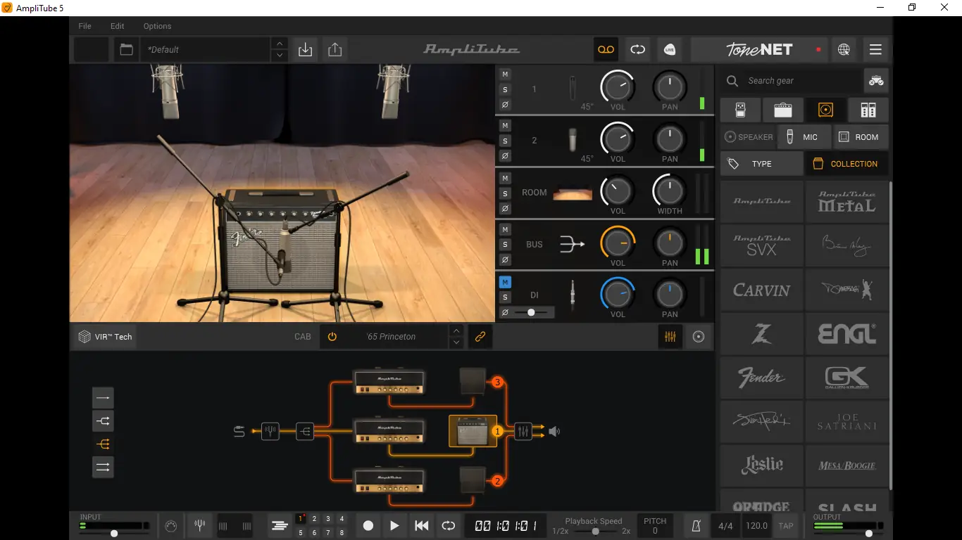 - Возможность комбинировать педали, усилители и кабинеты в любой последовательности