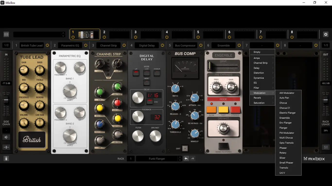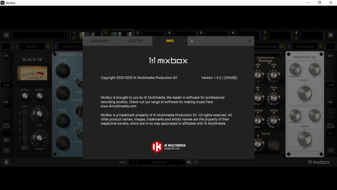 IK Multimedia MixBox — это не просто плагин, а полноценная экосистема звуковой обработки, вобравшая в себя лучшие алгоритмы из ведущих продуктов разработчика. Он позиционируется как виртуальный рэк-модуль, в котором можно комбинировать до восьми процессоров в одной цепи, создавая уникальные канальные полосы для вокала, инструментов или мастер-шины. Архитектура стиле 500-series обеспечивает модульность и компактность, а поддержка VST, AU и AAX делает его совместимым с большинством современных DAW.