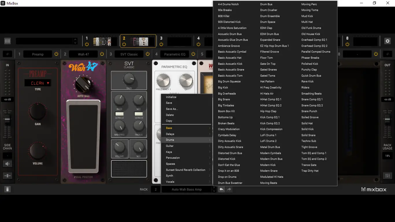 Использование MixBox начинается с выбора процессора из обширной библиотеки, который затем перетаскивается в один из слотов цепи. Каждый модуль оснащён слайдером Dry/Wet, что позволяет точно регулировать уровень эффекта без необходимости открывать дополнительные окна. В автономном режиме можно подключить до восьми независимых рэков, каждый из которых обрабатывает отдельный аудиопоток, что делает возможным сведение многоканальных проектов без участия DAW. Все настройки сохраняются как пресеты, доступные для повторного использования в других сессиях. Управление осуществляется централизованно с главной панели, где можно регулировать гейн, ввод сайд-чейна и активировать или деактивировать процессоры.
