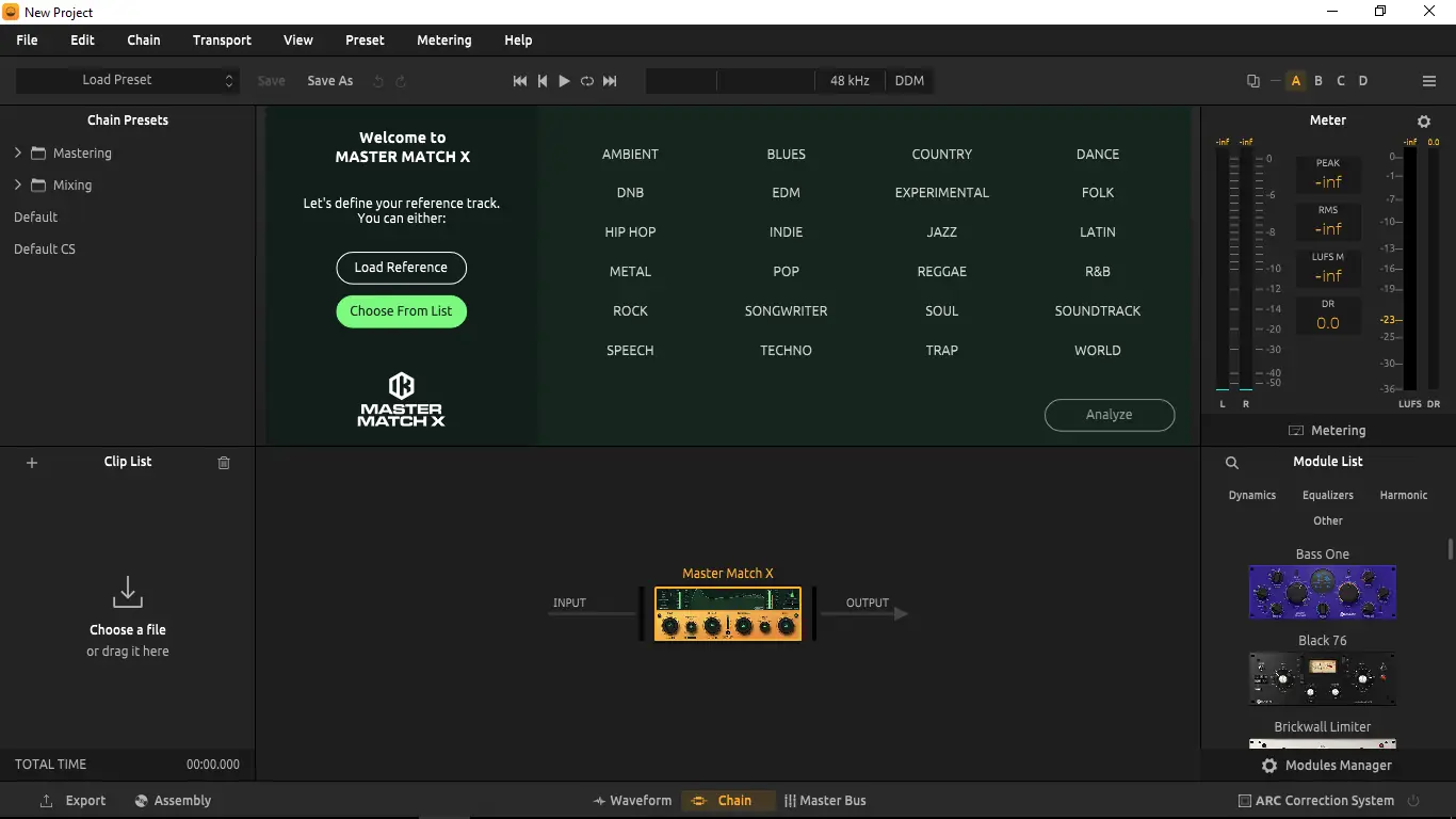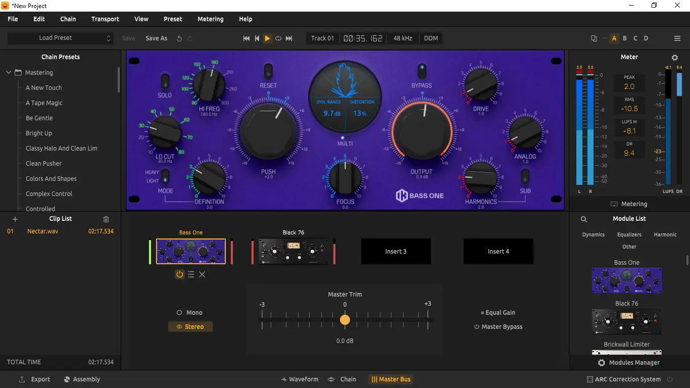 - Встроенный мастеринг-конвейер позволяет выстраивать цепочки обработки с возможностью A/B сравнения.