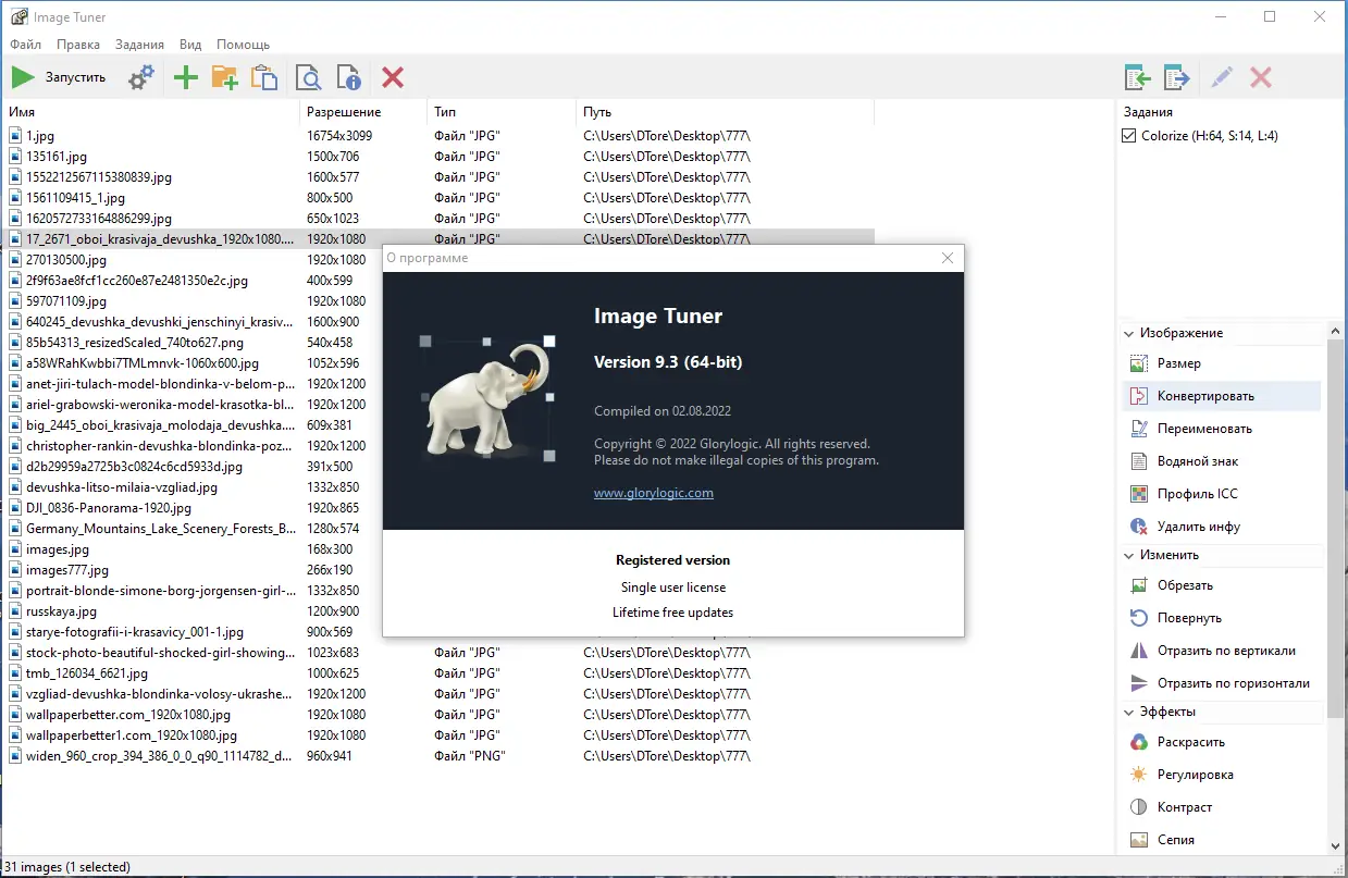 Для начала работы с Image Tuner достаточно добавить нужные изображения через проводник или перетащить их в окно программы. Далее выбирается требуемое действие — изменение размера, поворот, конвертация или нанесение водяного знака. После настройки параметров запускается процесс обработки, во время которого отображается подробный лог операций. Это позволяет отслеживать ход выполнения и при необходимости вносить корректировки. Поддержка тихой установки и автоматического выбора разрядности системы делает использование утилиты удобным на любом компьютере.