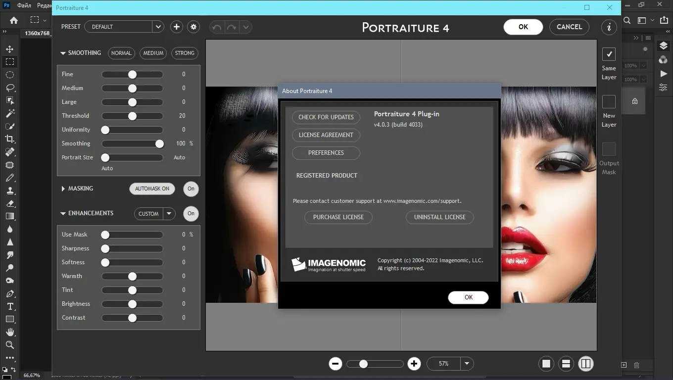 Imagenomic Portraiture — это мощный плагин для автоматической ретуши портретных фотографий, разработанный для профессиональной обработки кожи с сохранением естественной текстуры и деталей. Программа интегрируется в Adobe Photoshop и Lightroom, обеспечивая быструю и точную коррекцию тона кожи, устранение дефектов и улучшение визуального качества снимков. Благодаря интеллектуальной маске и гибким настройкам, ретушь становится максимально точной и при этом не требует глубоких знаний в области графического редактирования.