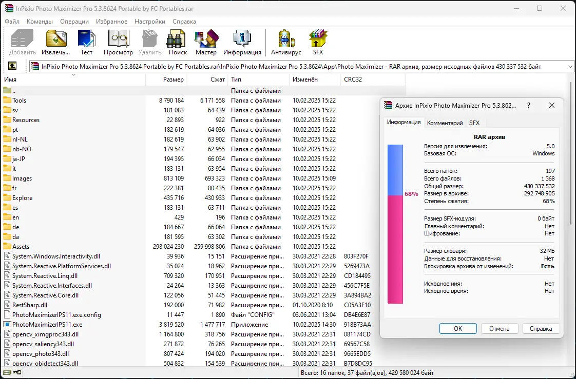 Программа доступна в различных версиях, включая лицензионную и портативную. Портативная сборка от FC Portables позволяет использовать InPixio Photo Maximizer на любом компьютере без необходимости инсталляции. Файл прошёл проверку на целостность по контрольным хэшам CRC32, MD5, SHA-1 и SHA-256, что гарантирует отсутствие повреждений и модификаций. Утилита совместима с современными версиями Windows и поддерживает как 32-, так и 64-битные системы.