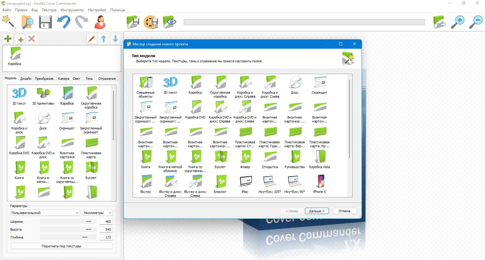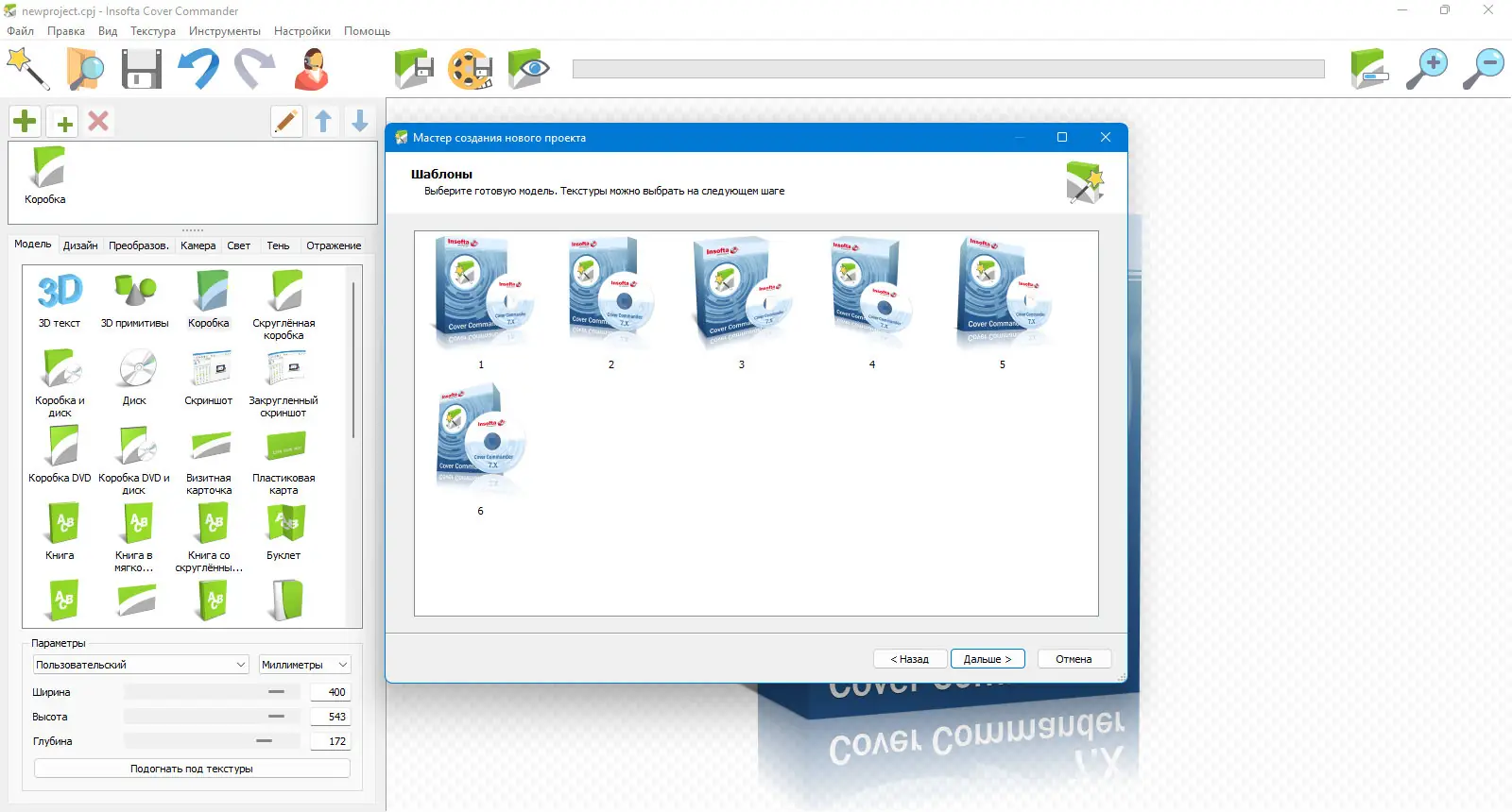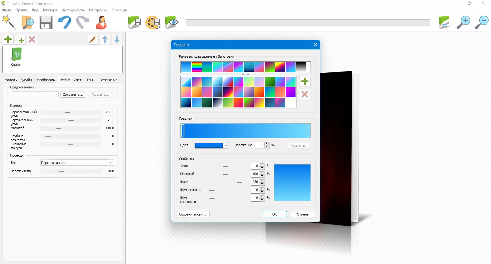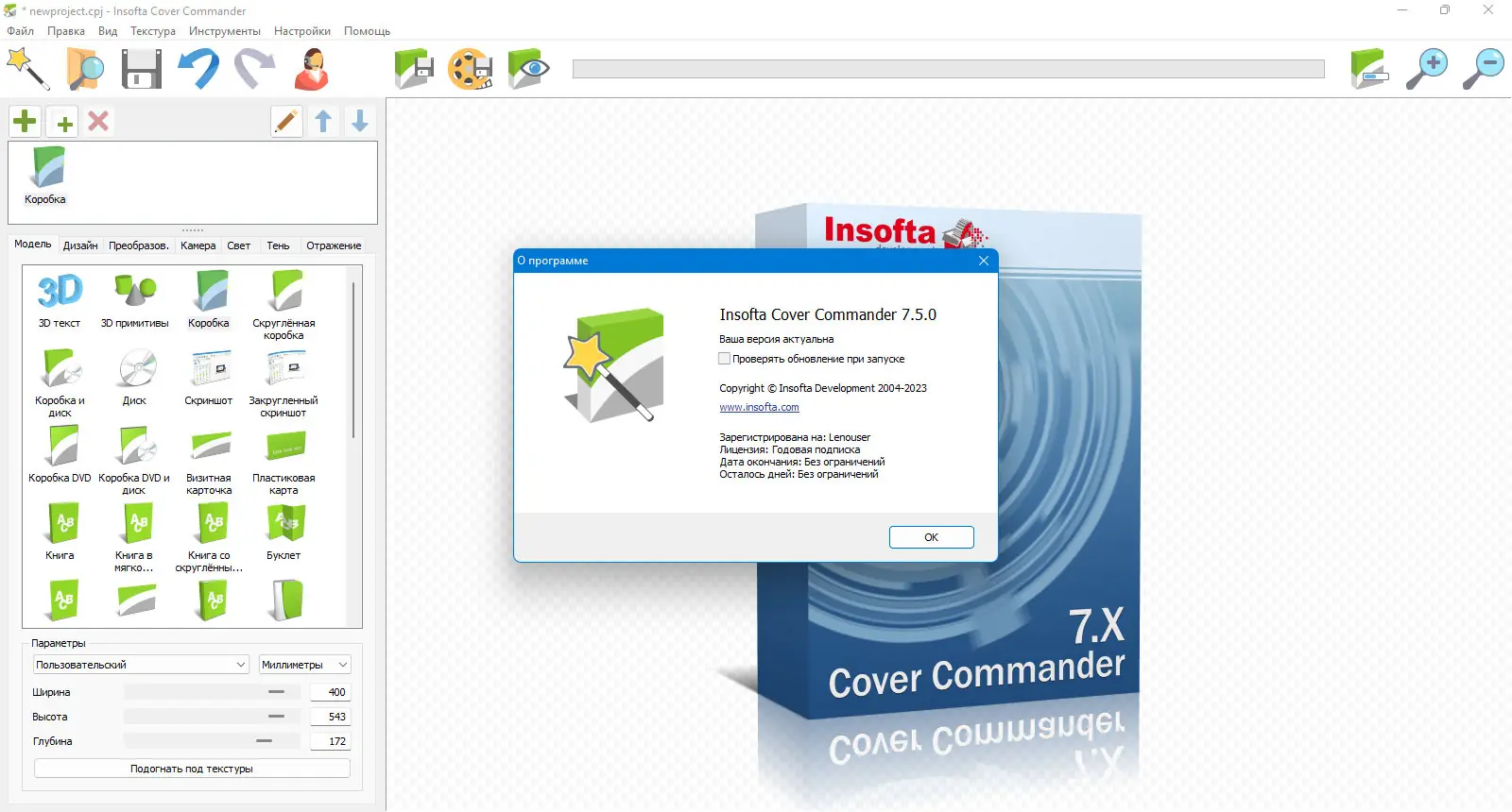 Использование Insofta Cover Commander начинается с выбора шаблона в мастере создания проекта. Далее пользователь загружает изображение обложки или вводит текст, который будет нанесён на 3D-модель. Все изменения отображаются в окне предпросмотра в реальном времени, что позволяет сразу оценить результат и внести корректировки. Настройки освещения, угла камеры и тени регулируются с помощью ползунков или числовых значений.