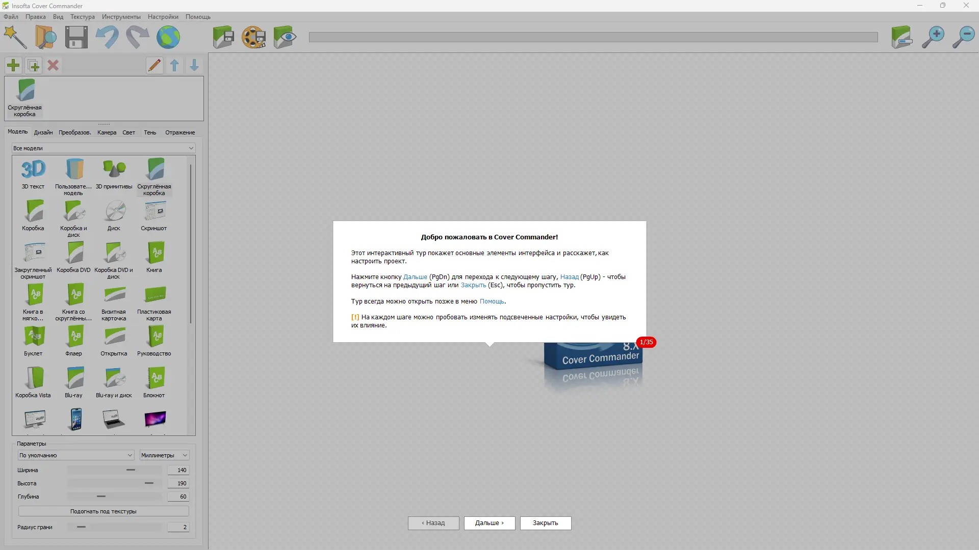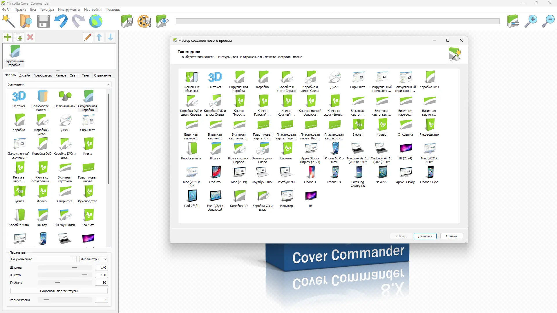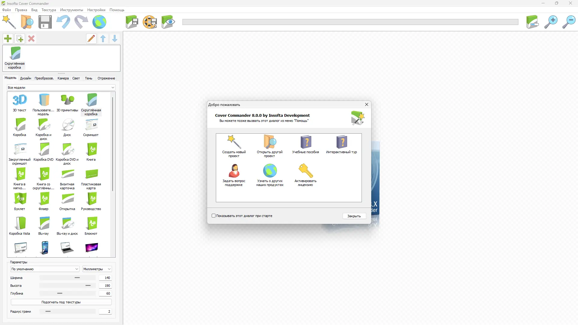 Работа с программой начинается с выбора модели в мастере создания проекта, где доступны категории устройств, дисков, книг и упаковок. Пользователь может наложить собственные изображения на поверхности объекта, настроить угол камеры, интенсивность света и параметры теней. В окне предпросмотра изменения отображаются в реальном времени, что ускоряет процесс подбора оптимального вида.
