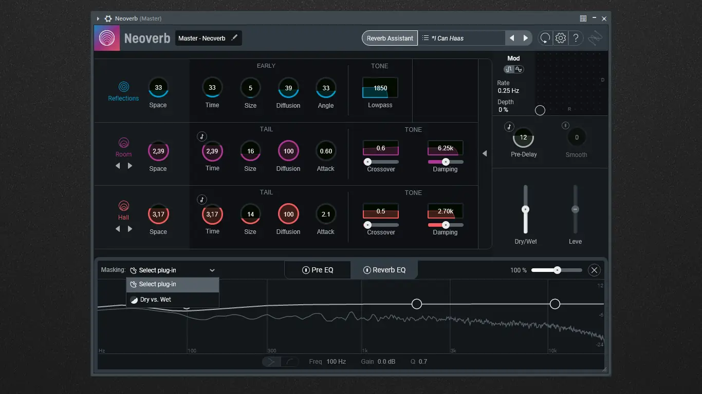 - Встроенный Reverb Assistant анализирует входной сигнал и автоматически предлагает оптимальные параметры реверберации, адаптированные под характер дорожки и предпочтения пользователя.