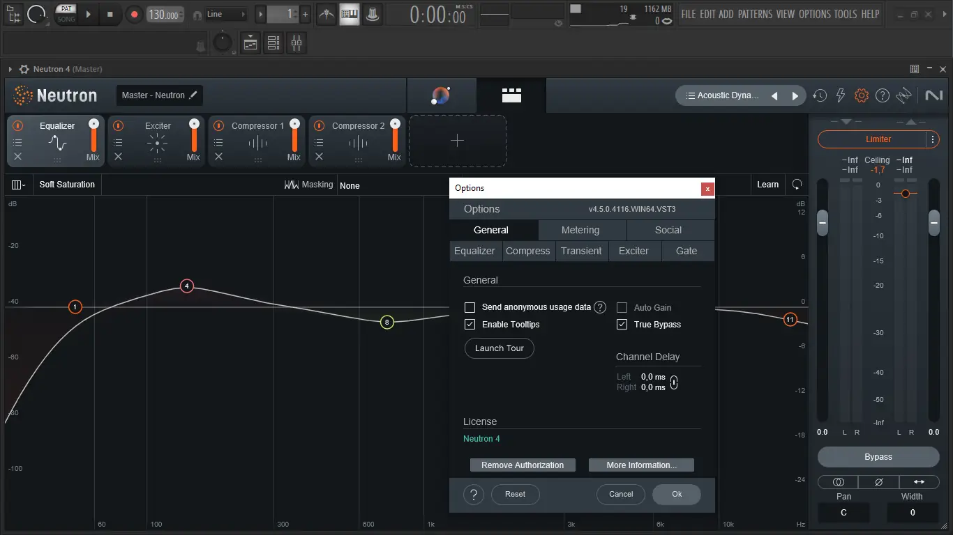 - Плагин предлагает восемь встроенных модулей для обработки звука, включая компрессор, эквалайзер и эксайтер.