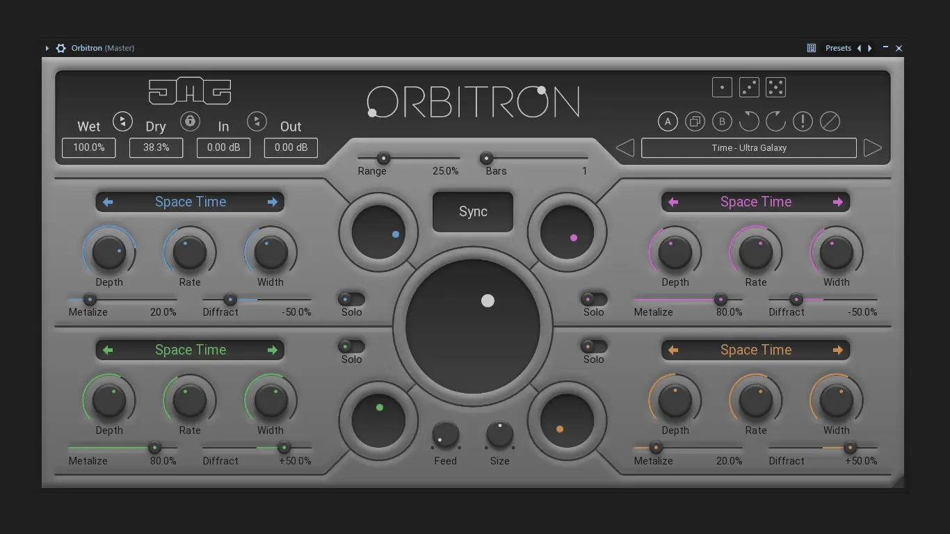 - Orbitron включает четыре модульных эффекта модуляции, которые можно комбинировать или переключать по тактам.