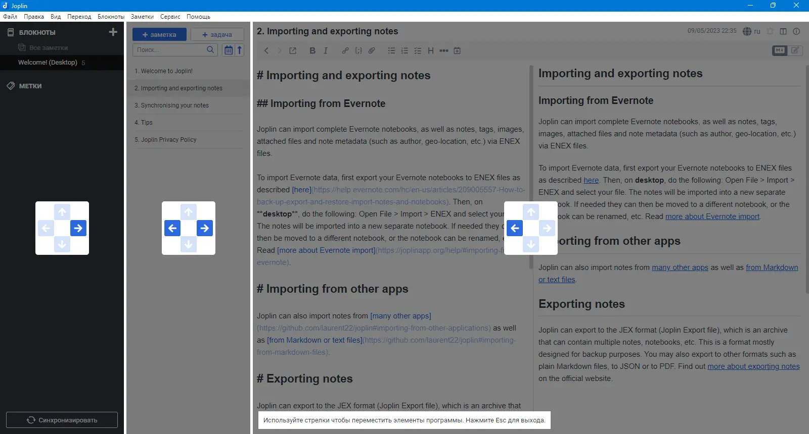 Использование Joplin начинается с установки приложения на выбранное устройство. После запуска пользователь может создавать заметки, организовывая их в блокноты и подблокноты, а также добавлять теги для быстрого поиска. Редактирование осуществляется в удобном визуальном редакторе с предпросмотром Markdown, при этом можно переключаться в режим чистого кода. Импорт данных поддерживается из файлов .enex и простых Markdown-документов, включая вложения и метаданные. Синхронизация настраивается через настройки приложения, где указывается тип хранилища и путь к удалённой папке. После настройки все изменения автоматически отражаются на всех подключённых устройствах. Пользователи могут использовать шифрование для дополнительной защиты конфиденциальных заметок.