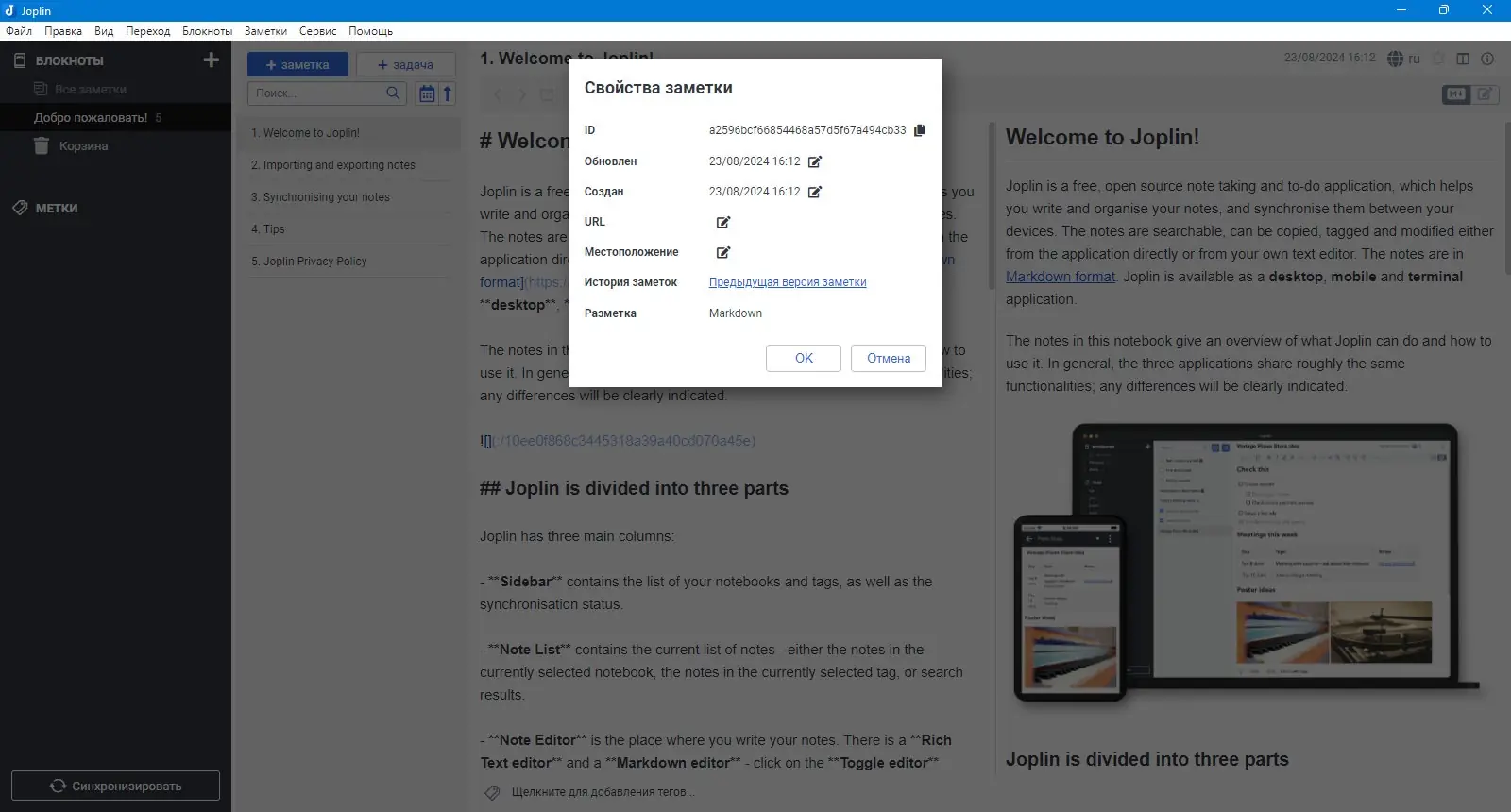 Joplin представляет собой многофункциональное приложение для создания и хранения заметок, разработанное с акцентом на приватность, переносимость и совместимость. Оно работает на различных платформах, включая настольные и мобильные системы, обеспечивая единый интерфейс и синхронизацию данных между ними. Приложение поддерживает организацию заметок в блокноты, назначение тегов, поиск по содержимому и работу с метаданными. Особое внимание уделено поддержке формата Markdown, что делает редактирование структурированных текстов удобным и гибким. Пользователи могут не только редактировать записи в самом приложении, но и напрямую через сторонние текстовые редакторы, так как заметки хранятся в виде простых файлов.