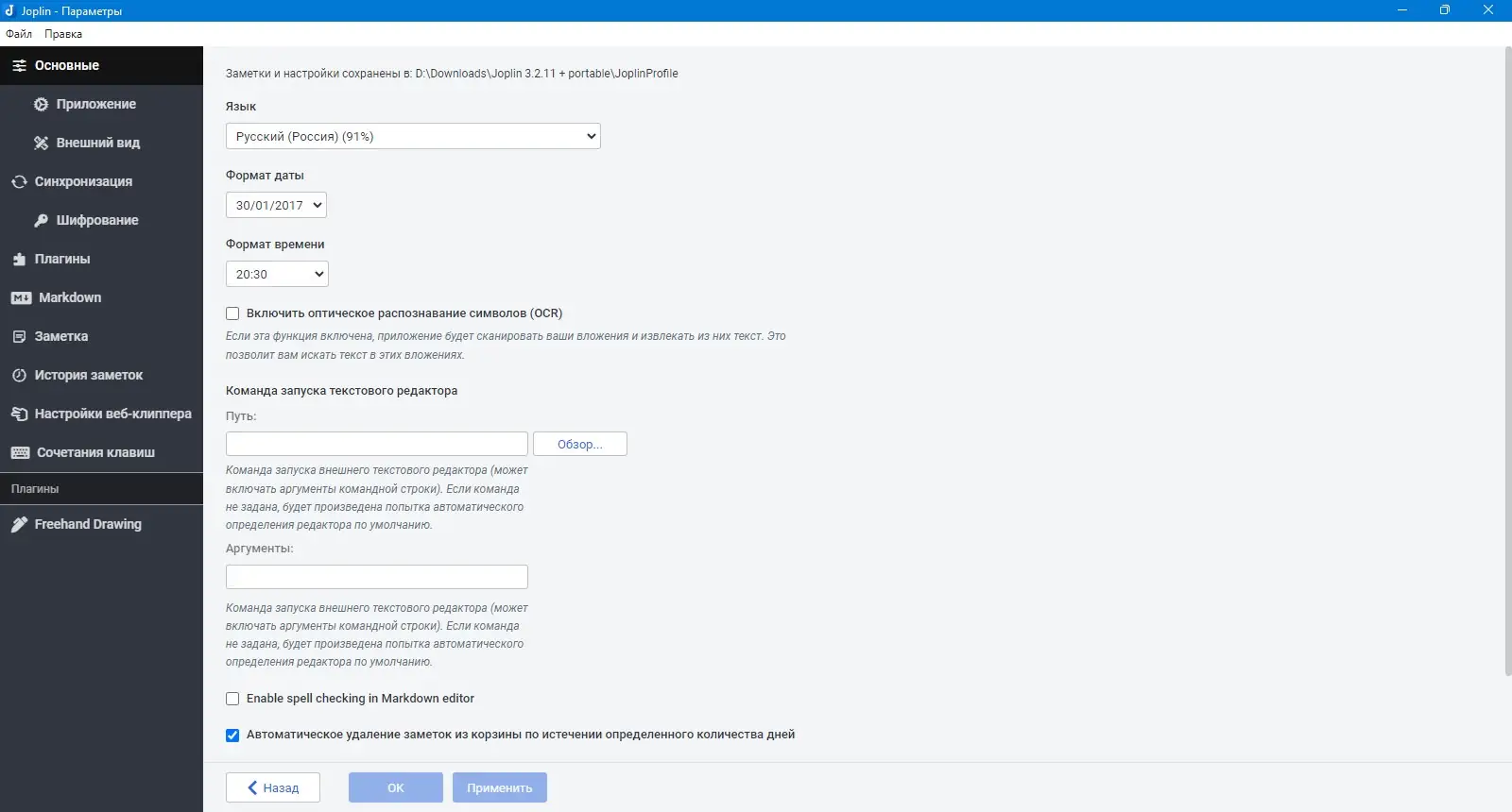 - Поддержка портативного режима на Windows даёт возможность использовать Joplin с USB-накопителя без установки.