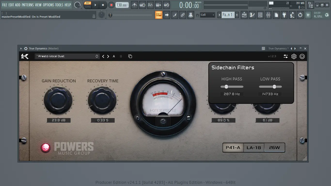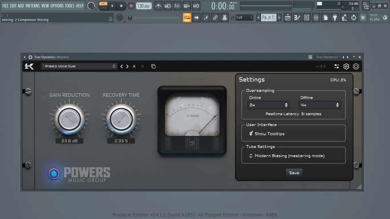 Использование Kazrog True Dynamics интуитивно понятно даже новичкам. После загрузки плагина в DAW пользователь видит чистый интерфейс с центральным селектором модели компрессора. Основные регуляторы — Gain Reduction, Recovery, Mix и Output — расположены в удобном порядке, а переключатель между режимами работы занимает центральное место. Для точной настройки доступны расширенные панели, где можно включить избыточную дискретизацию, настроить фильтрацию боковой цепи или активировать режим с нулевой задержкой, что особенно полезно при записи вокала или инструментов в реальном времени. Встроенный байпас с компенсацией уровня позволяет честно сравнивать обработанный и необработанный сигнал.